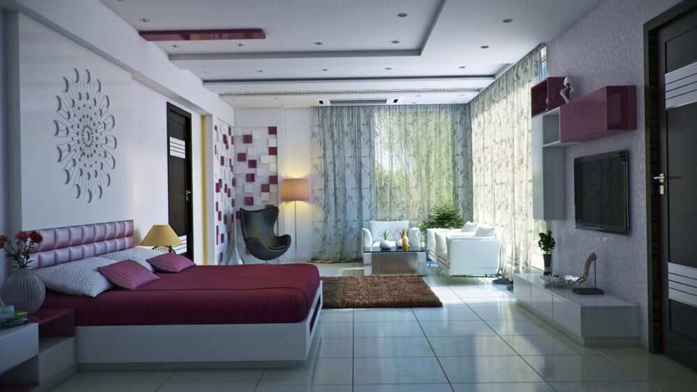 -शयनकक्षमा हल्का गुलाबी रंगको किरण पर्दा दम्पतीहरूमा प्रेमभाव जाग्छ भन्ने मान्यता छ ।