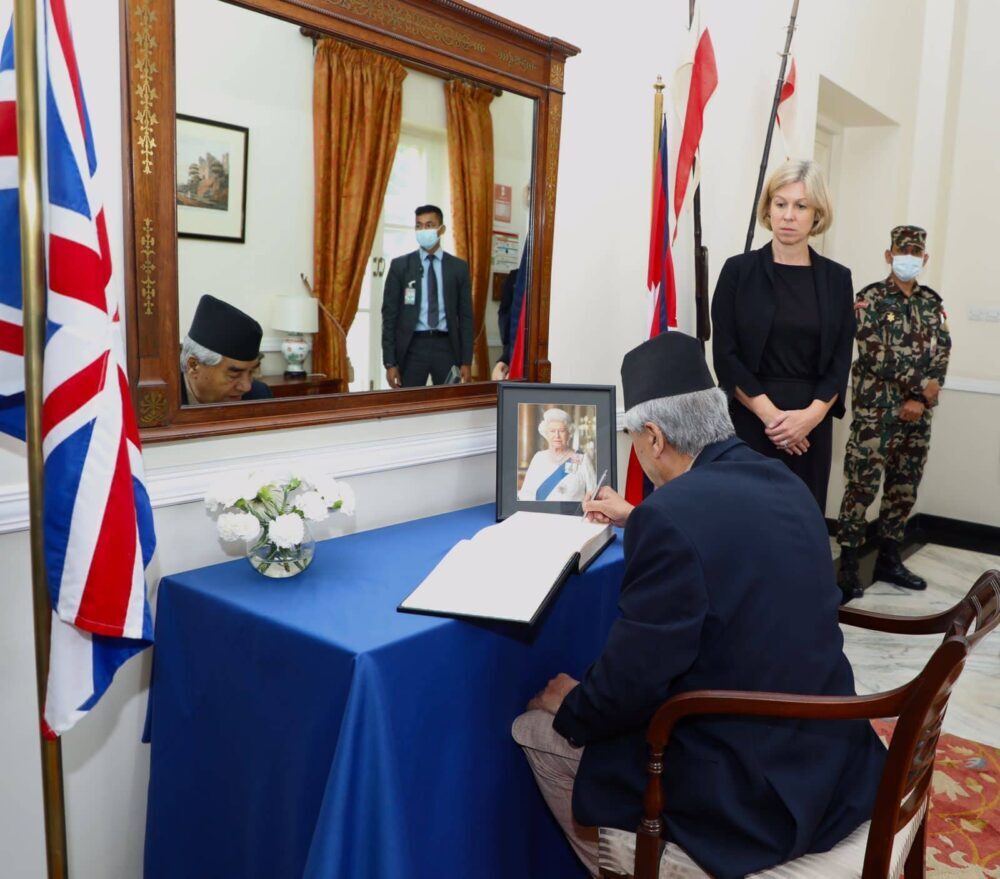 प्रधानमन्त्रीले शनिबार बिहान काठमाडौंस्थित बेलायती दूतावासमा पुगेर महारानीको निधनमा दुःख व्यक्त गर्नुभएको हो । साथै उहाँले दूतावासमा राखिएको शोक पुस्तिकामा शोक सन्देश पनि लेख्नु भएको छ ।