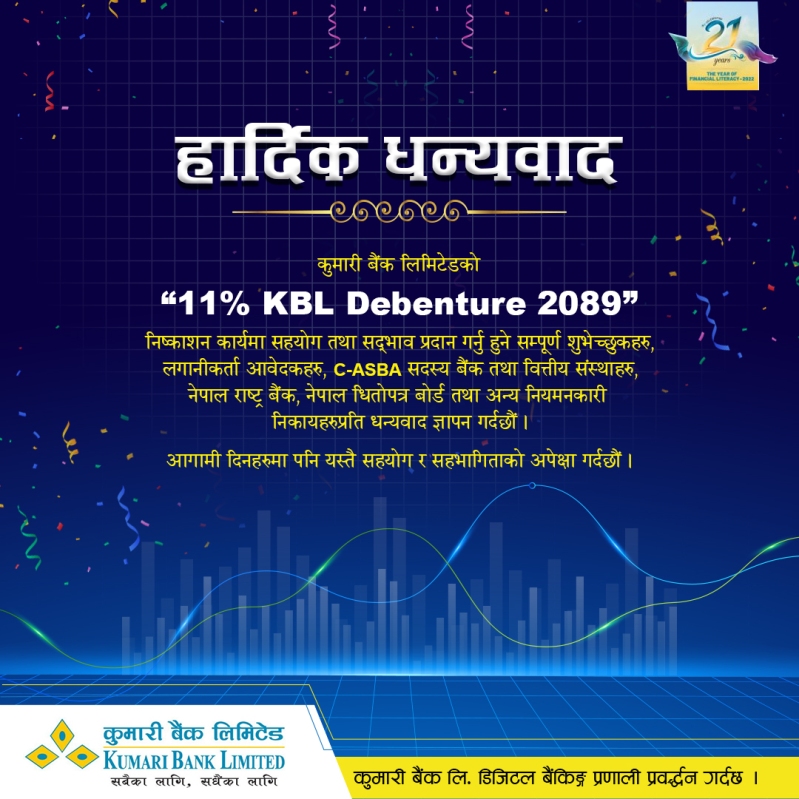 कुमारी बैंकले निष्कासन गरेको ‘११ प्रतिशत केबीएल डिबेञ्चर २०७९’ बाँडफाँट भएको छ । बैंकले १० वर्षे अवधि तथा वार्षिक ११ प्रतिशत व्याजदर भएको ऋणपत्र अंकित मूल्य प्रतिकित्ता १ हजारका दरले ३ अर्ब बराबरको ३० लाख कित्ता निष्कासन गर्ने स्वीकृति पाएको थियो ।