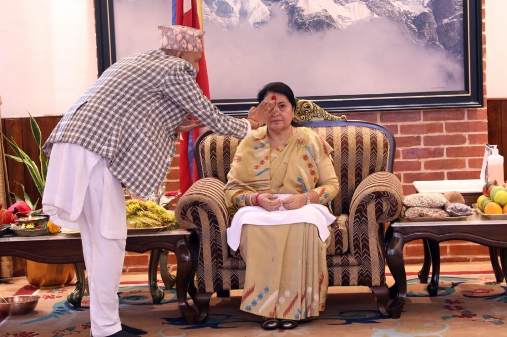 राष्ट्रपति विद्यादेवी भण्डारीले गुरूहरू देवराज अर्याल र खेमचन्द्र ढकालको हातबाट बडादसैँको टीका ग्रहण गर्नुभएको छ ।