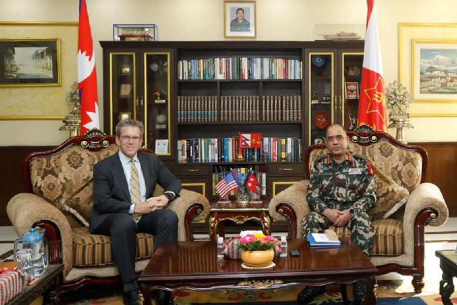 नेपाली सेनाका प्रमुख जनरल प्रभुराम शर्मासँग संयुक्त राज्य अमेरिकाका राजदूत रिचर्ड थम्पसनले भेटवार्ता गर्नुभएको छ । सेनाप्रमुख शर्मालाई भेट्न राजदूत थम्पसन मङ्गलबार दिउँसो भद्रकालीस्थित नेपाली सेनाको मुख्यालय जङ्गी अड्डामा पुग्नुभएको थियो ।