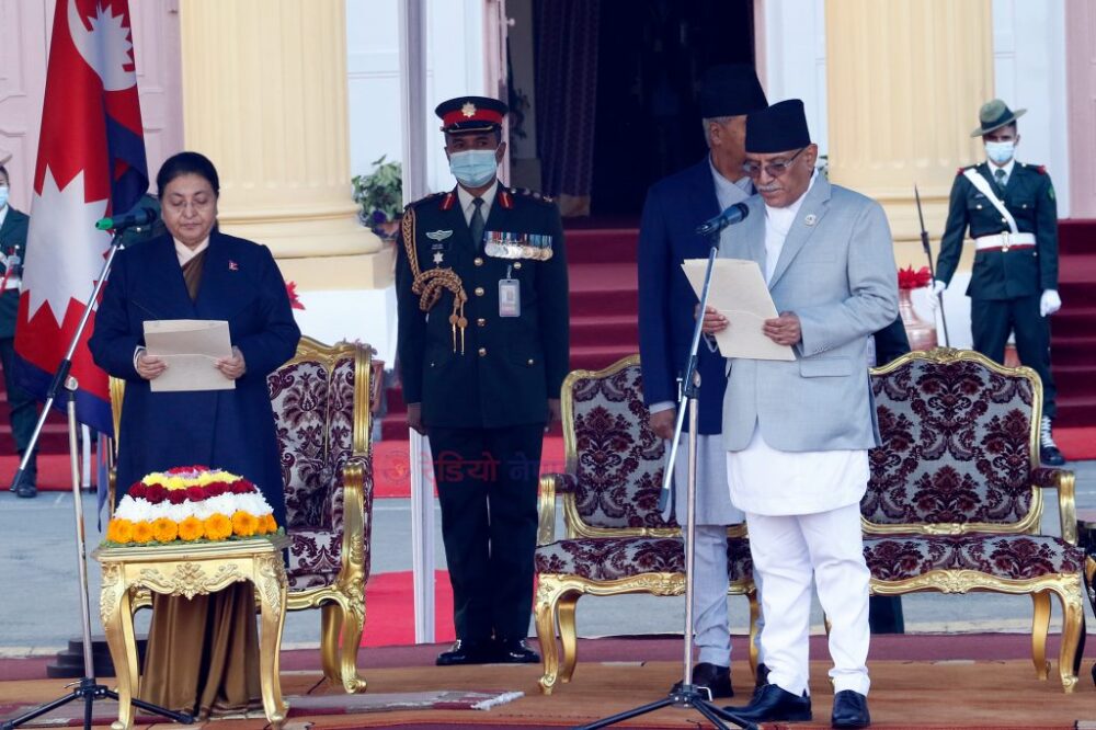 राष्ट्रपति विद्यादेवी भण्डारीले नवनियुक्त प्रधानमन्त्री पुष्पकमल दाहाल ‘प्रचण्ड’लाई पद तथा गोपनीयताको शपथ गराउनुभएको छ ।