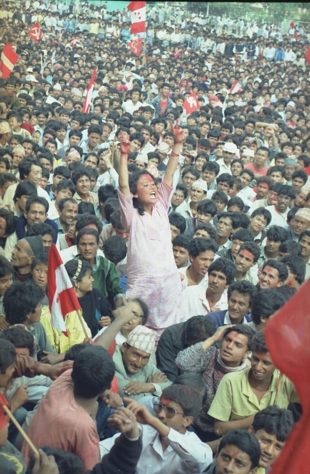 त्यसको भोलिपल्ट चैत २७ गते टुँडिखेल खुलामञ्चमा भेला भएर जनताले विजयोत्सव मनाए । खुसीयाली मनाइरहेका जनसमुदायको त्यस घडीको एउटा फोटोले त्यसबेला निक्कै चर्चा बटुल्यो – त्यतिखेरको राजनीतिक माहोल र जनभावना प्रतिबिम्बित गर्न सकेको भनेर । प्रतिबन्धित दलका झन्डाहरूमाझ सेतो पहिरनमा रहेकी एक महिलाले उल्लासमा दुवै हात उठाइरहेको फोटो थियो त्यो । ती महिला दुर्गा थापा हुनुहुन्थ्यो ।