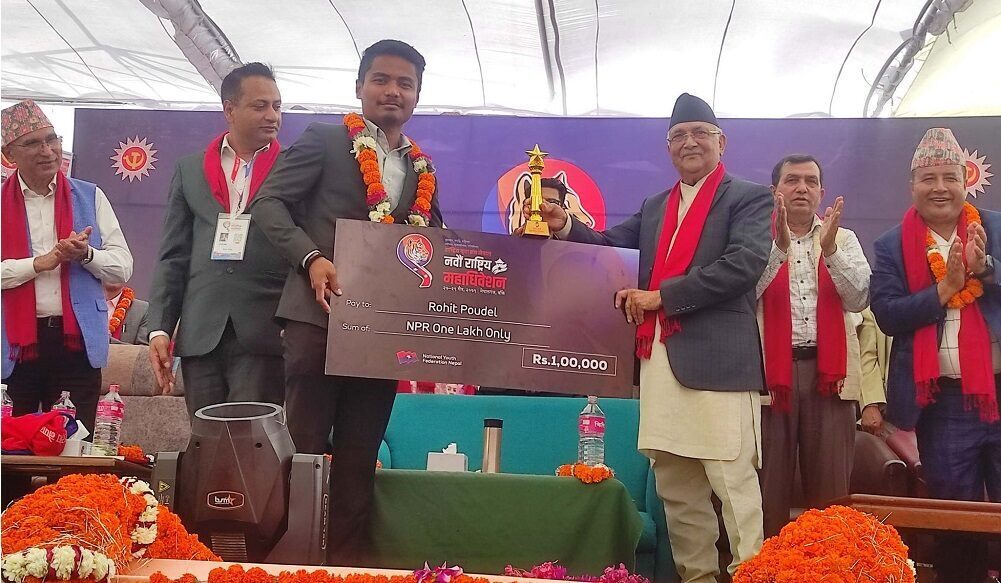युवा सङ्घ नेपालको नेपालगञ्जमा सोमबारबाट सुरु भएको नवौँ राष्ट्रिय महाधिवेशनको उद्घाटन समारोहमा नेकपा (एमाले)का अध्यक्ष केपी शर्मा ओलीले कप्तान पौडेललाई एक लाख रुपियाँको चेक र ट्रफी प्रदान गर्नुभएको हो ।
