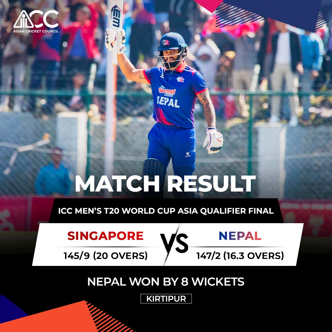 आइसिसी ट्वान्टी २० विश्वकप एशिया छनोटको आफ्नो पहिलो खेलमा नेपालले सिङ्गापुरलाई आठ विकेटले पराजित गर्दै प्रतियोगितामा सुखद सुरुवात गरेको छ ।
