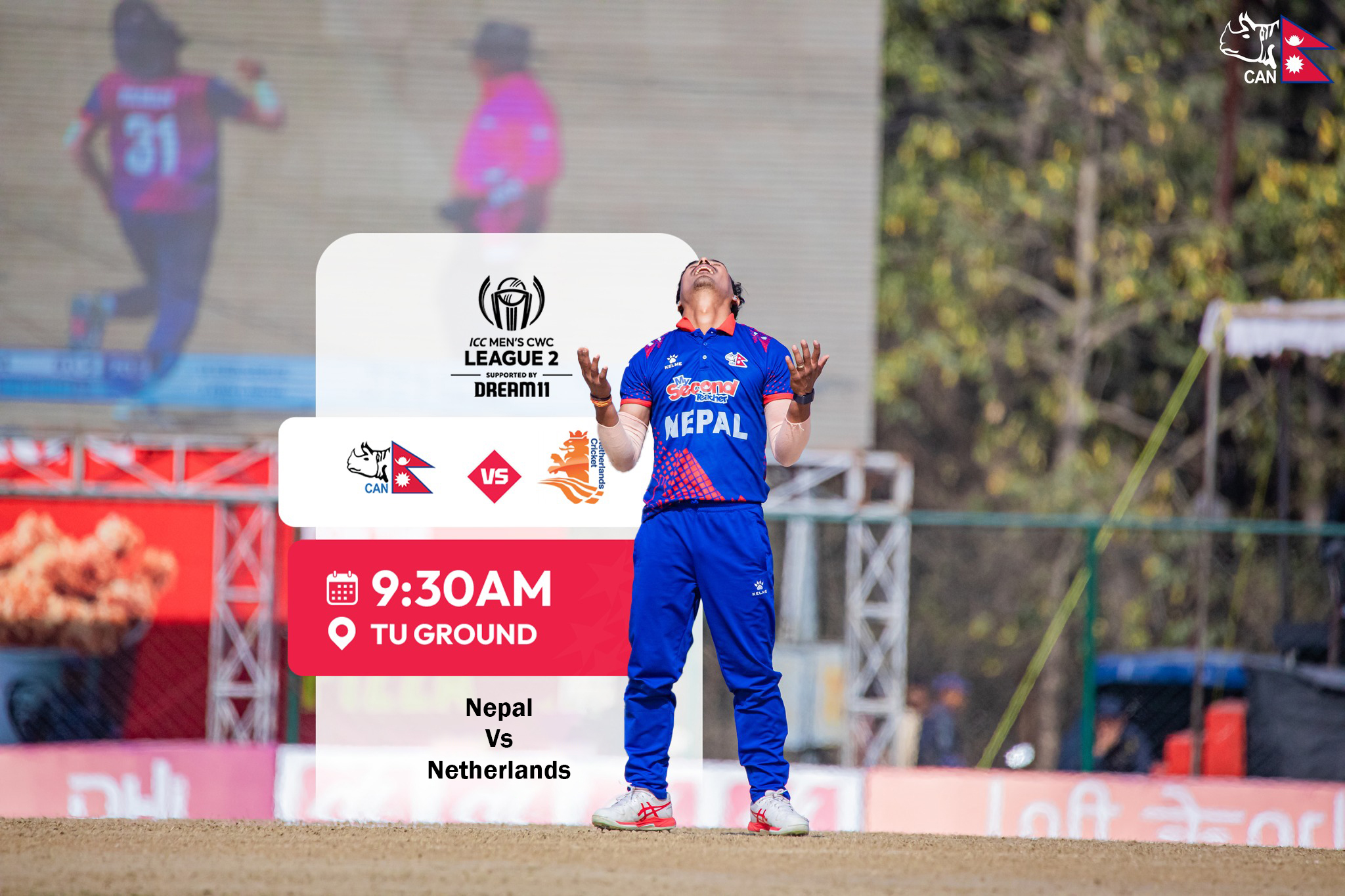 आइसीसी अन्तर्राष्ट्रिय विश्वकप लिग-२ क्रिकेट अन्तरगत त्रिदेशीय एकदिवसीय शृङ्खलामा नेपालले आज दोस्रो खेल खेल्दैछ । किर्तिपुरस्थित त्रिवि मैदानमा हुने खेलमा नेपालले नेदरल्याण्डससंग प्रतिस्पर्धा गर्न लागेको हो ।