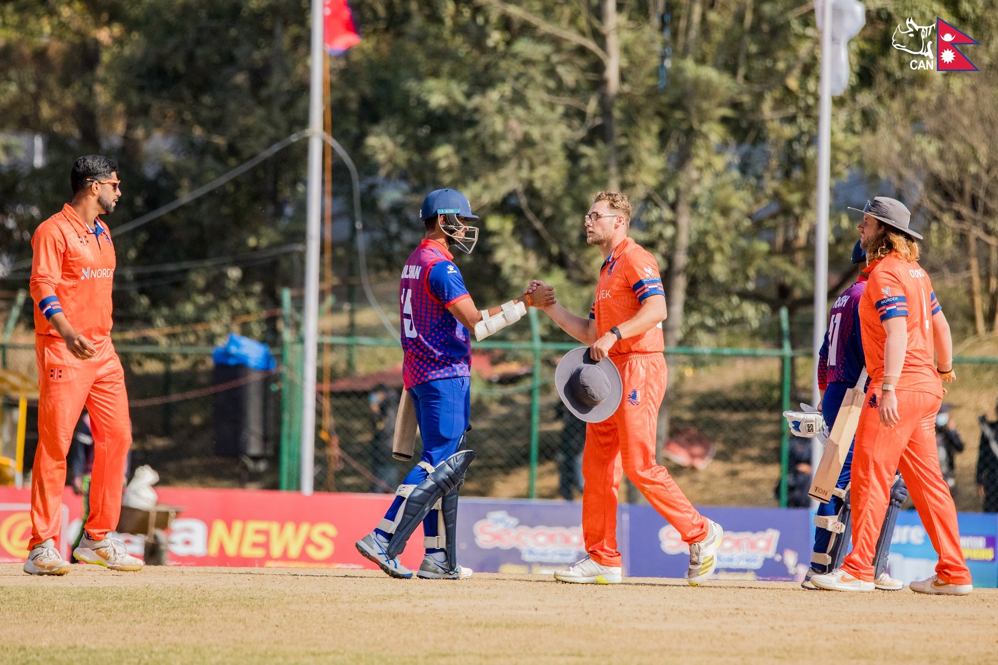नेदरल्यान्ड्सले प्रस्तुत गरेको एक सय ८५ रनको लक्ष्य पछ्याएको नेपाल निर्धारित २० ओभरमा आठ विकेट गुमाउँदै एक सय ८२ रनमा समेटियो । नेपाललाई जितका लागि अन्तिम ओभरमा १५ रन चाहिएको थियो ।
