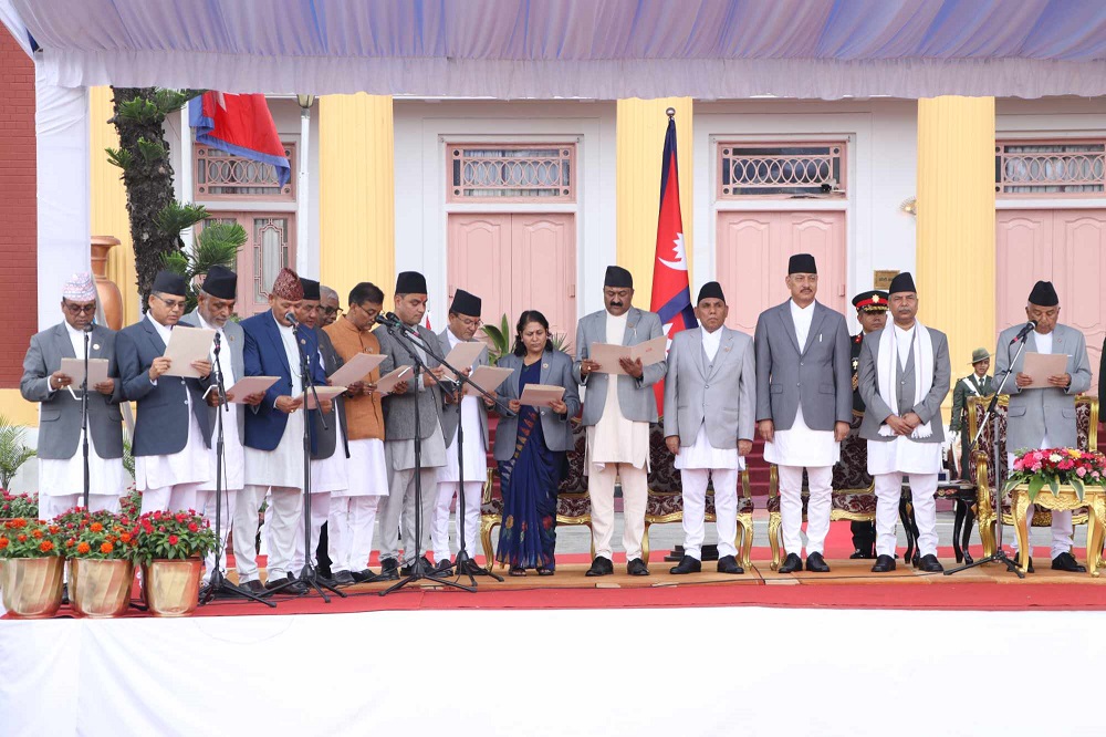 नवनियुक्त मन्त्रीहरुले आज बिहान राष्ट्रपति भवन शीतल निवासमा आयोजित विशेष समारोहमा राष्ट्रपति पौडेलसमक्ष पद तथा गोपनीयताको शपथ लिनुभएको हो ।