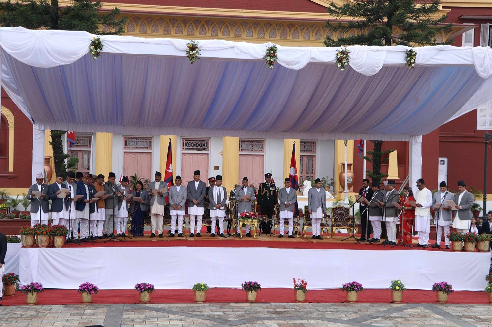 राष्ट्रपति रामचन्द्र पौडेलले नवनियुक्त १९ मन्त्रीलाई आज पद तथा गोपनीयताको शपथ गराउनुभएको छ ।
