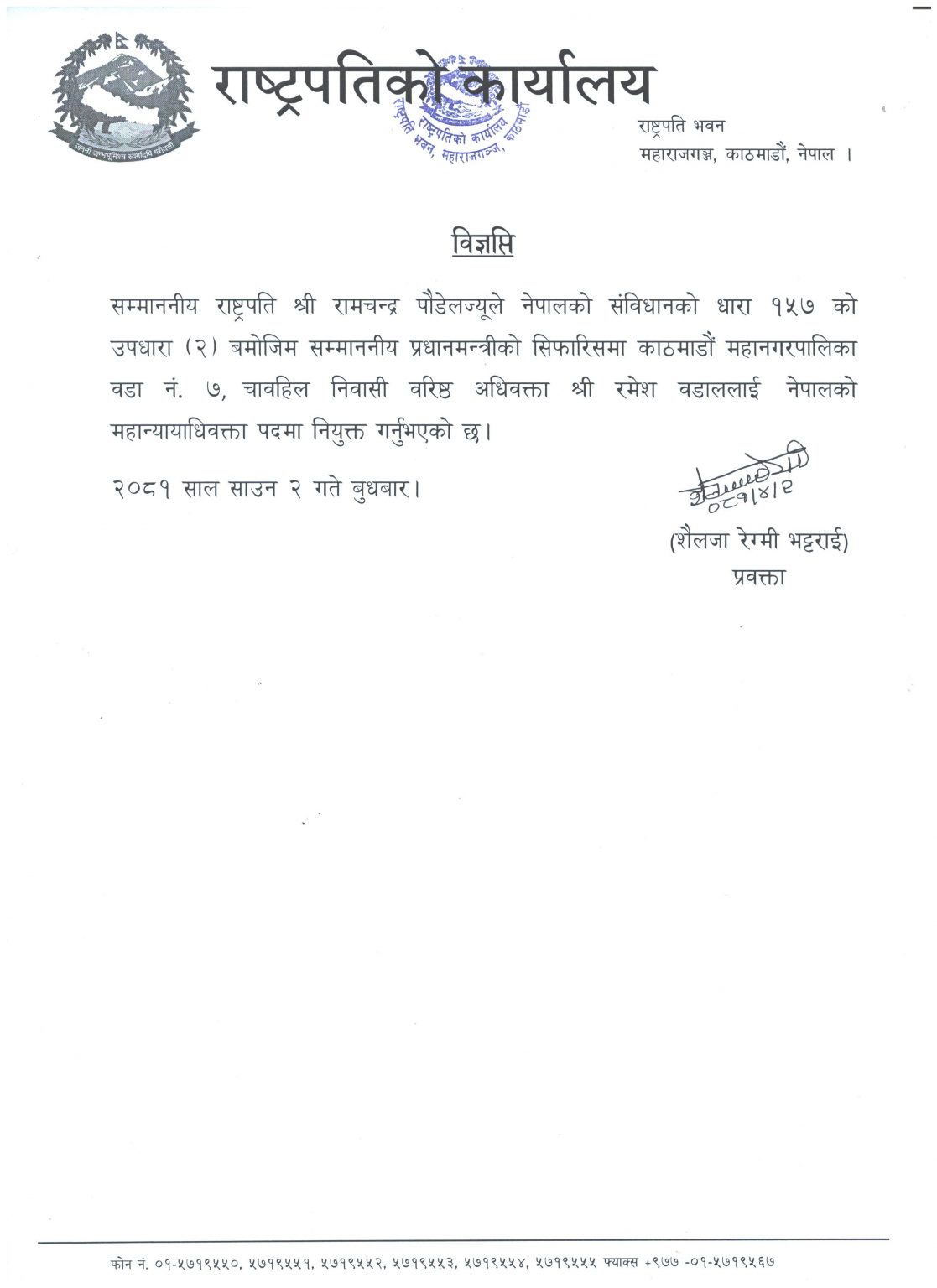 प्रधानमन्त्री केपी शर्मा ओलीको सिफारिसमा राष्ट्रपति पौडेलले नेपालको संविधानको धारा १५७ को उपधारा (२) बमोजिम काठमाडौँ महानगरपालिका–७ चाबहिल निवासी वडाललाई महान्यायाधिवक्तामा नियुक्त गरिएको राष्ट्रपति कार्यालयबाट जारी सूचनामा उल्लेख छ ।