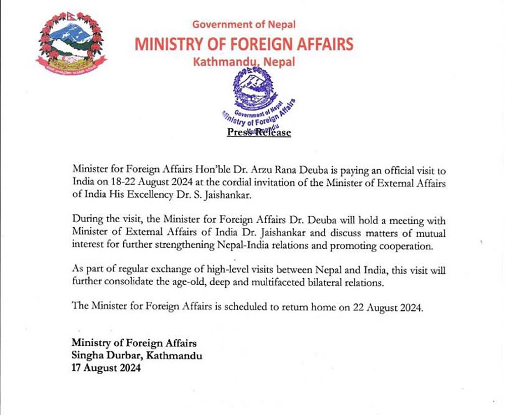 परराष्ट्रमन्त्री डा. आरजु राणा देउवा यही भदौ २ गतेदेखि छिमेकी मित्र राष्ट्र भारतको औपचारिक भ्रमणमा जानुहुने भएको छ।