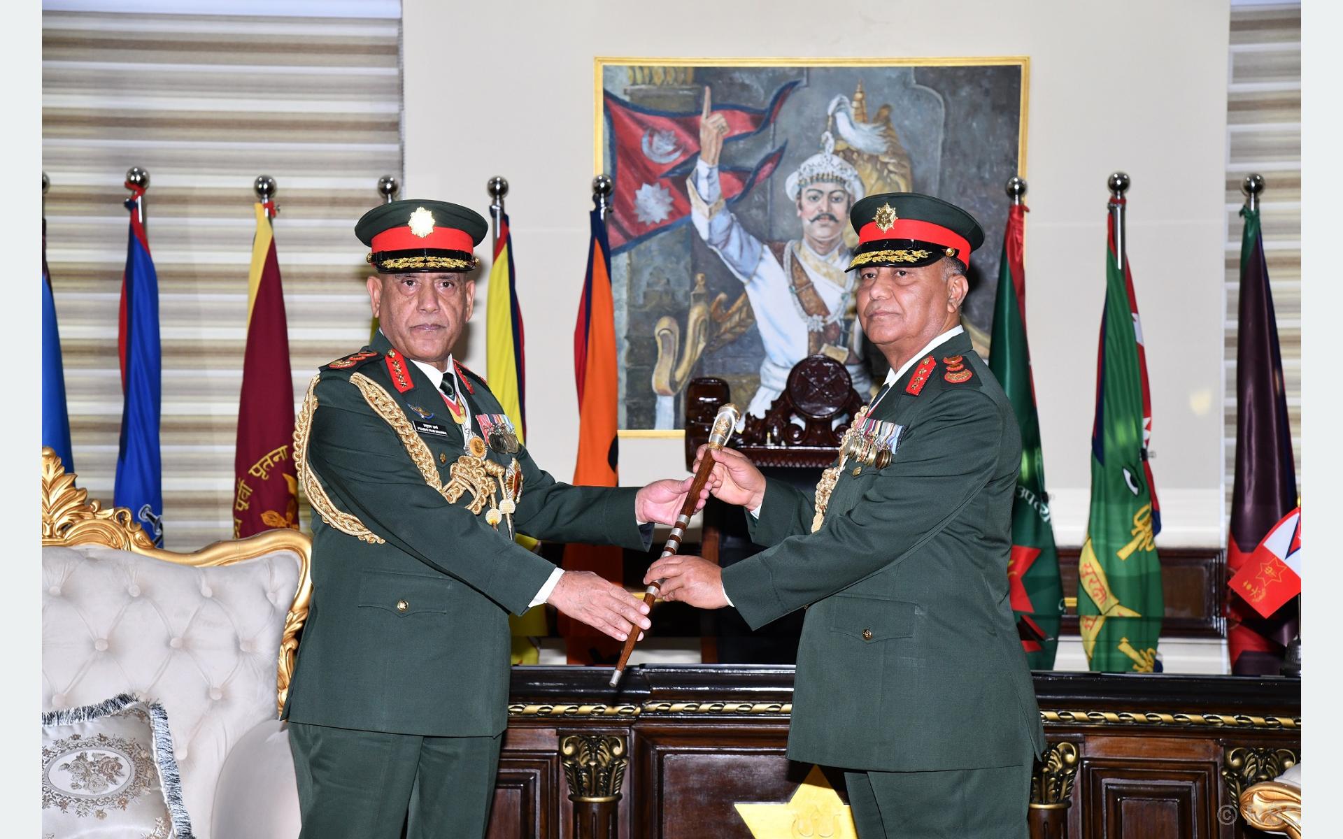 यस अघि प्रधान सेनापति शर्माले कामु प्रधानसेनापति सिग्देललाई नेपाली सेनाको झन्डा, प्रधानसेनापतिको झन्डा तथा छडी हस्तान्तरण गर्नुभएको थियो भने प्रधानसेनापति शर्माको सम्मानमा एक टुकडीले सम्मान गारद समेत अर्पण गरेको थियो । रासस