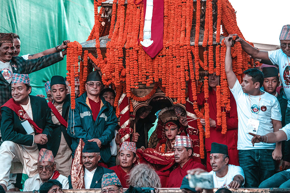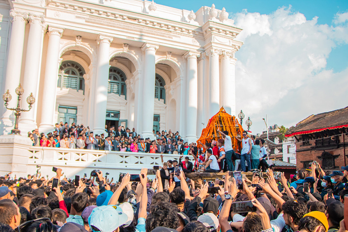 आजको दिन मुख्य रूपमा मनाइने इन्द्रजात्रा पर्वमा राष्ट्रपतिबाट हनुमानढोकास्थित गद्दी बैठकमा जीवित देवीका रूपमा रहेका श्री गणेश, श्री भैरव र श्री कुमारीको रथयात्रा नजर गर्ने परम्परा छ । राजतन्त्र रहुञ्जेल राजाबाट श्री गणेश, श्री भैरव र श्री कुमारीको रथयात्रा नजर गर्ने परम्परा थियो ।