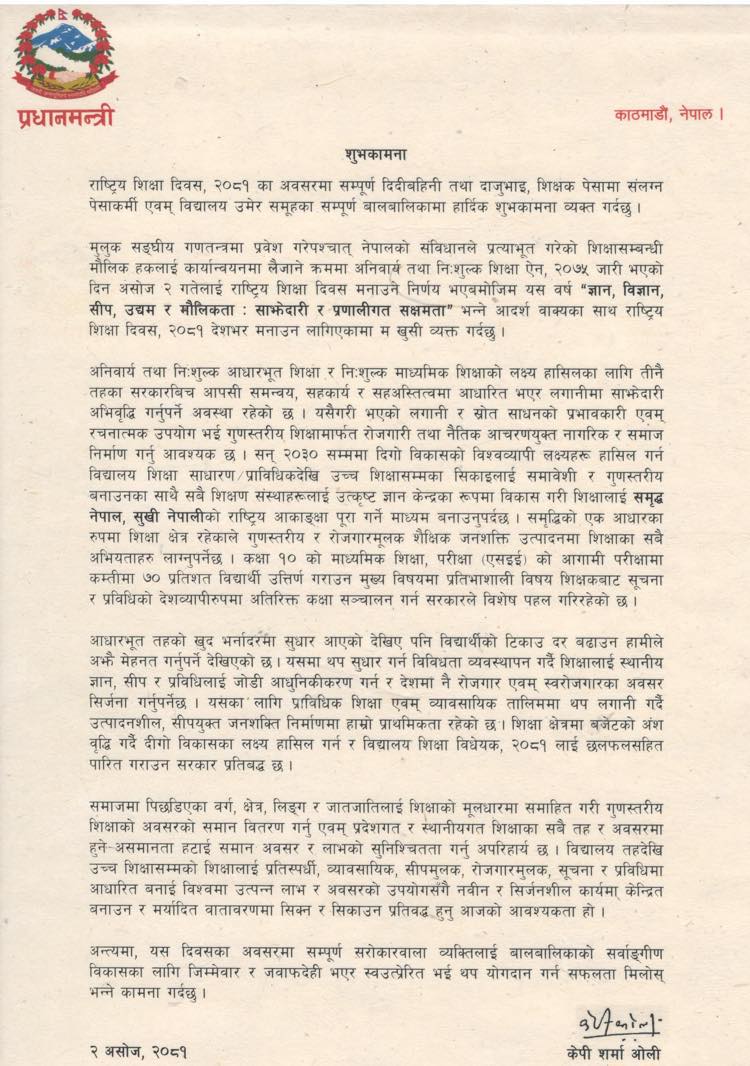 नेपालको संविधानले प्रत्याभूत गरेको शिक्षासम्बन्धी मौलिक हकलाई कार्यान्वयनमा लैजाने क्रममा अनिवार्य तथा निःशुल्क शिक्षा ऐन, २०७५ जारी भएको दिन असोज २ गतेलाई राष्ट्रिय शिक्षा दिवस मनाउने निर्णय भएको थियो । यसवर्ष ‘ज्ञान, विज्ञान, सीप, उद्यम र मौलिकता : साझेदारी र प्रणालीगत सक्षमता’ भन्ने आदर्श वाक्यका साथ राष्ट्रिय शिक्षा दिवस, २०८१ देशभर मनाउन लागिएकामा प्रधानमन्त्रीले खुसी व्यक्त गर्नुभएको छ ।