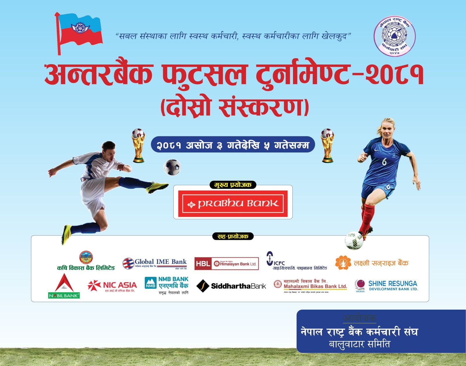 नेपाल राष्ट्र बैंक कर्मचारी संघ बालुवाटार समितिले संविधान दिवस अवरमा आज असोज ३ देखि ५ गतेसम्म दोस्रो संस्करणको अन्तरबैंक फुटसल टुर्नामेन्ट आजदेखी शुरु भएको छ।