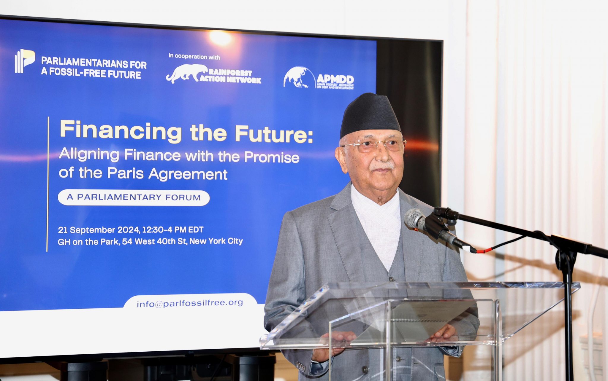 नेपाली प्रतिनिधिमण्डलको नेतृत्व गर्दै संयुक्त राष्ट्रसङ्घको ७९औँ महासभामा भाग लिने क्रममा संयुक्त राज्य अमेरिकाको न्युयोर्क आइपुग्नुभएका प्रधानमन्त्री ओलीले स्थानीय समयअनुसार शनिबार आयोजित जीवाष्म इन्धनमुक्त संसदीय सञ्जाल (पार्लियामेन्टेरियन्स फर फोसिल फ्युल फ्रि) को कार्यक्रममा मुख्य वक्ताका रूपमा सम्बोधनका क्रममा उक्त कुरा बताउनुभएको हो ।