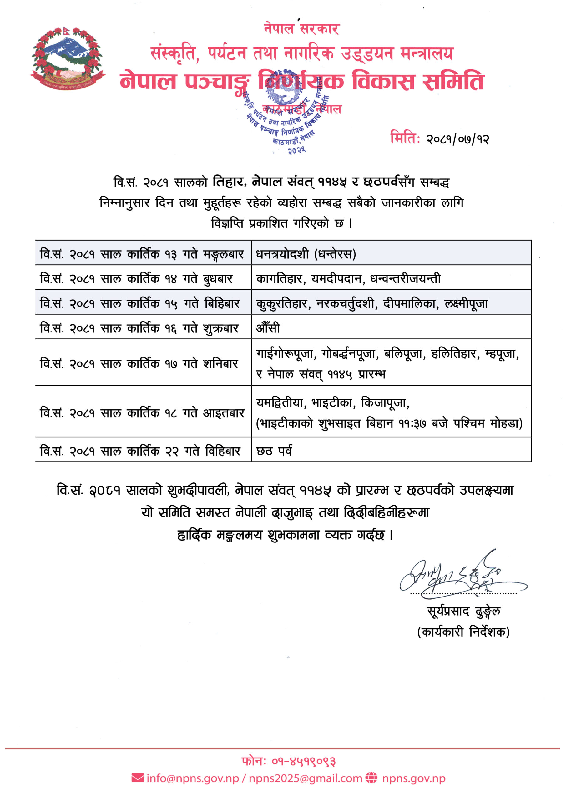 कात्तिक १७ गते शनिबार भने गाईगोरु पूजा, गोवद्र्धनपूजा, बलिपूजा, हलीतिहार, म्ह (आत्म) पूजा र नेपाल संवत् ११४५ प्रारम्भ पनि गरी छवटा पर्व एकै दिन परेको समितिले स्वीकृति दिएका पात्रो (पञ्चाङ्ग) र भित्तेपात्रोमा उल्लेख गरिनुका साथै समितिले तिहारको अवसरमा जारी गरेको विज्ञप्तिमा पनि प्रष्ट रूपमा लेखिएको छ ।