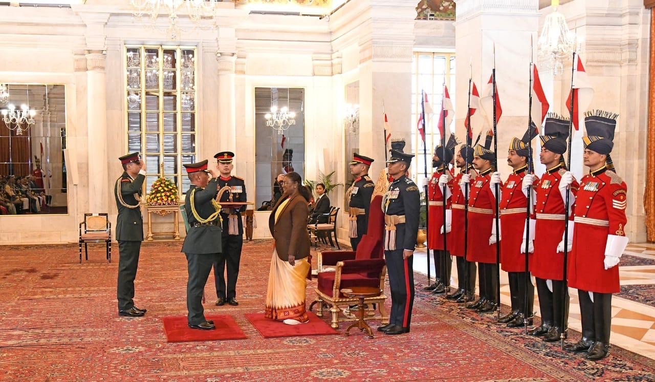 मित्रराष्ट्र भारतको औपचारिक भ्रमणमा रहनु भएका प्रधान सेनापति अशोक राज सिग्देललाई आज भारतीय राष्ट्रपति श्रीमती द्रौपदी मुर्मुले राष्ट्रपति भवनमा आयोजित विशेष सुशोभन कार्यक्रममा भारतीय स्थल सेनाको मानार्थ महारथी दर्जाको दर्ज्यानी चिन्ह प्रदान गर्नु भएको छ ।