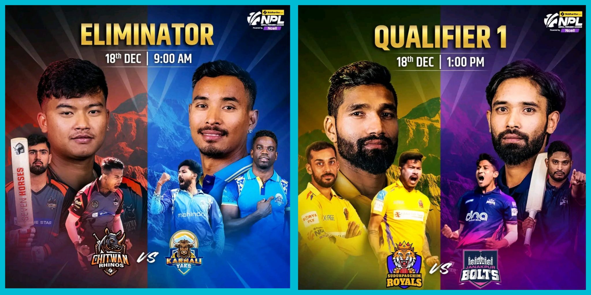 अंक तालिकाको शीर्ष र दोस्रो स्थानमा रहने टोलीले पहिलो क्वालिफायर्स खेल्नेछन् । तेस्रो र चौथो स्थानमा रहने टोलीले एलिमिनेटर खेल्नेछन् । कीर्तिपुरस्थित त्रिवि क्रिकेट मैदानमा आज बिहान हुने पहिलो खेलमा एलिमिनेटर खेलमा तेस्रो स्थानको चितवन राइनोज र चौथो स्थानमा रहेको कर्णाली याक्स भिड्नेछन् ।