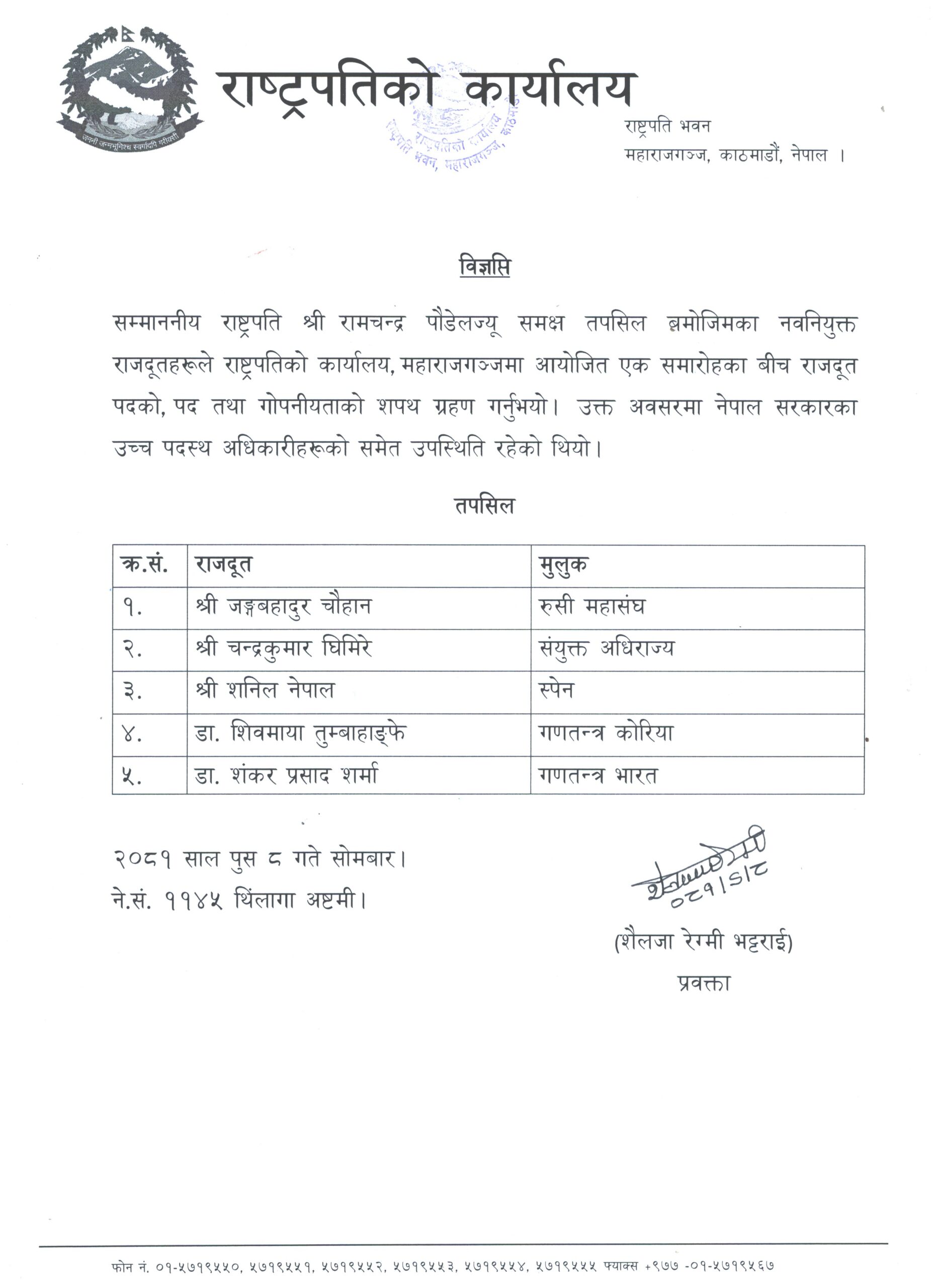 शीतलनिवासमा आयोजित समारोहमा राष्ट्रपति पौडेलसमक्ष रुसी महाङ्घका लागि नवनियुक्त राजदूत जङ्गबहादुर चौहान, संयुक्त अधिराज्यका राजदूत चन्द्रकुमार घिमिरे, स्पेनका राजदूत शनिल नेपाल, गणतन्त्र कोरियाका राजदूत डा. शिवमाया तुम्बाहाङ्फे र गणतन्त्र भारतका राजदूत डा. शङ्करप्रसाद शर्माले पद तथा गोपनीयताको शपथ ग्रहण गर्नुभएको राष्ट्रपति कार्यालयले जनाएको छ ।