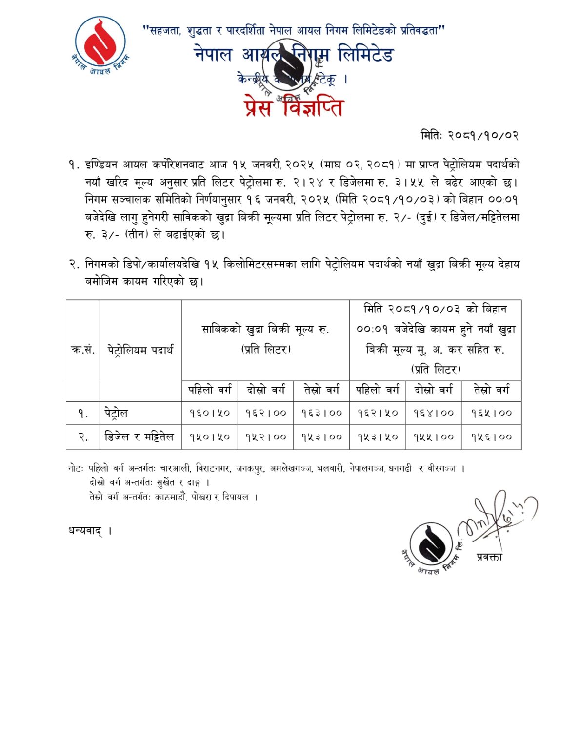 मूल्य वृद्धिसँगै १६० रुपैयाँ ५० पैसा प्रति लिटर (पहिलो वर्ग पेट्रोलको मूल्य १६२ रुपैयाँ ५० पैसा पुगेको छ। दोस्रो वर्ग अन्तर्गत १६२ रुपैयाँ पर्ने प्रतिलिटर पेट्रोलको मूल्य १६४ रुपैयाँ पर्नेछ भने तेस्रो वर्ग अनुसार १६३ रुपैयाँ पर्ने पेट्रोलको मूल्य १६५ रुपैयाँ पर्नेछ।
