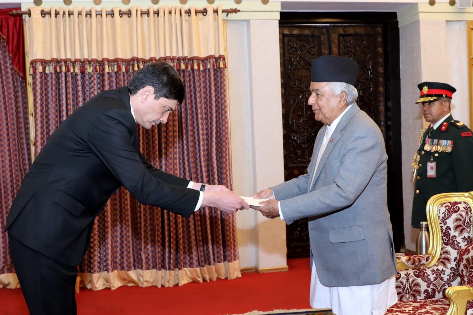 आज राष्ट्रपति भवनमा आयोजित छुट्टाछुट्टै विशेष समारोहमा नवनियुक्त राजदूतहरु जापानका मेडा तोरु, तुर्कमेनिस्तानका शालार गेल्डिनाजारोभ, आलोसका बाउन्मी भ्यान्मानी र इरानका डा इराज इलाहीले राष्ट्रपति पौडेलसमक्ष ओहोदाको प्रमाणपत्र पेस गर्नुभएको हो ।