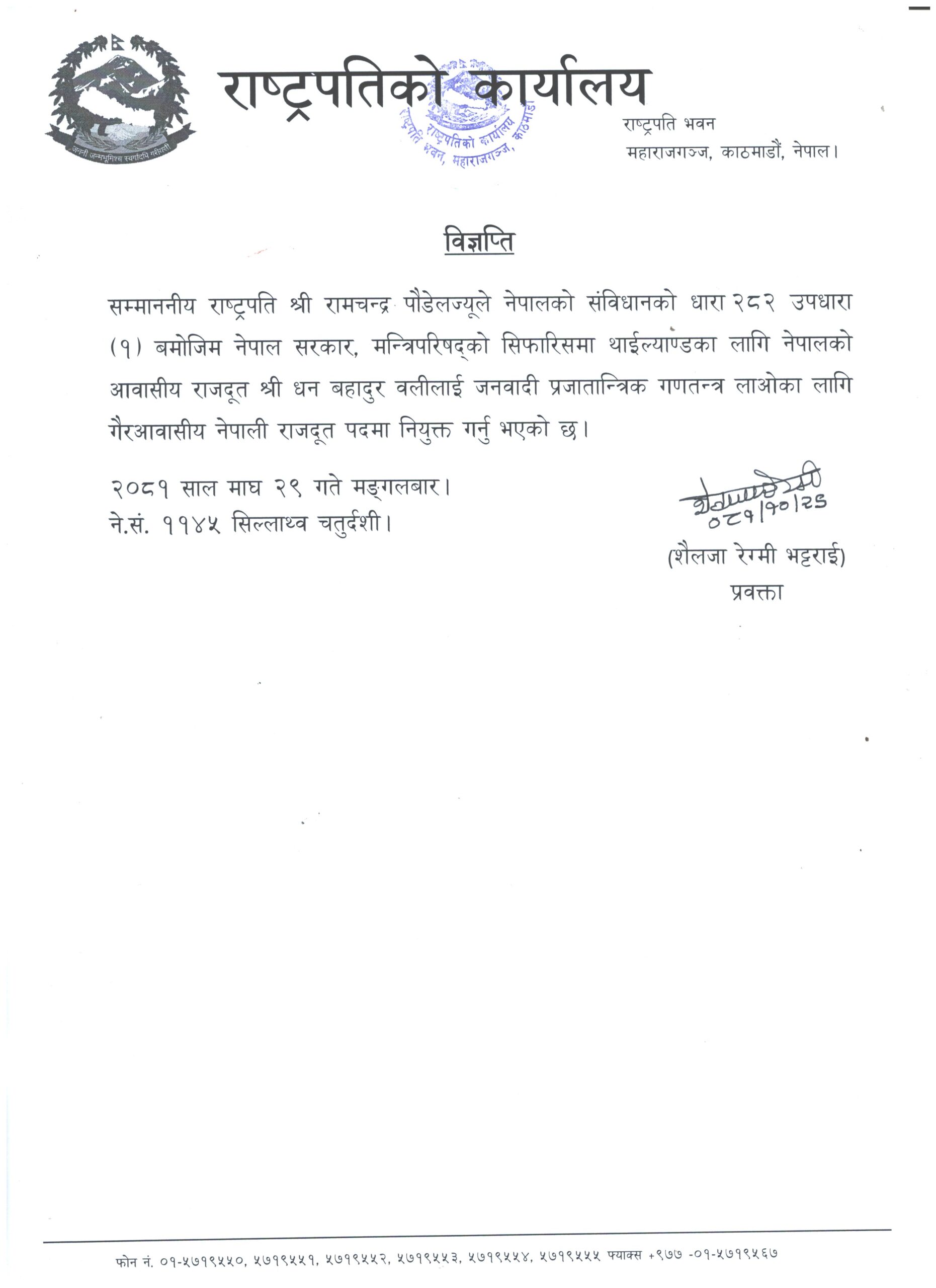मङ्गलबार राष्ट्रपति पौडेलले संविधानको धारा २८२ को उपधारा (१) बमोजिम वलीलाई राजदूत नियुक्त गर्नुभएको हो ।