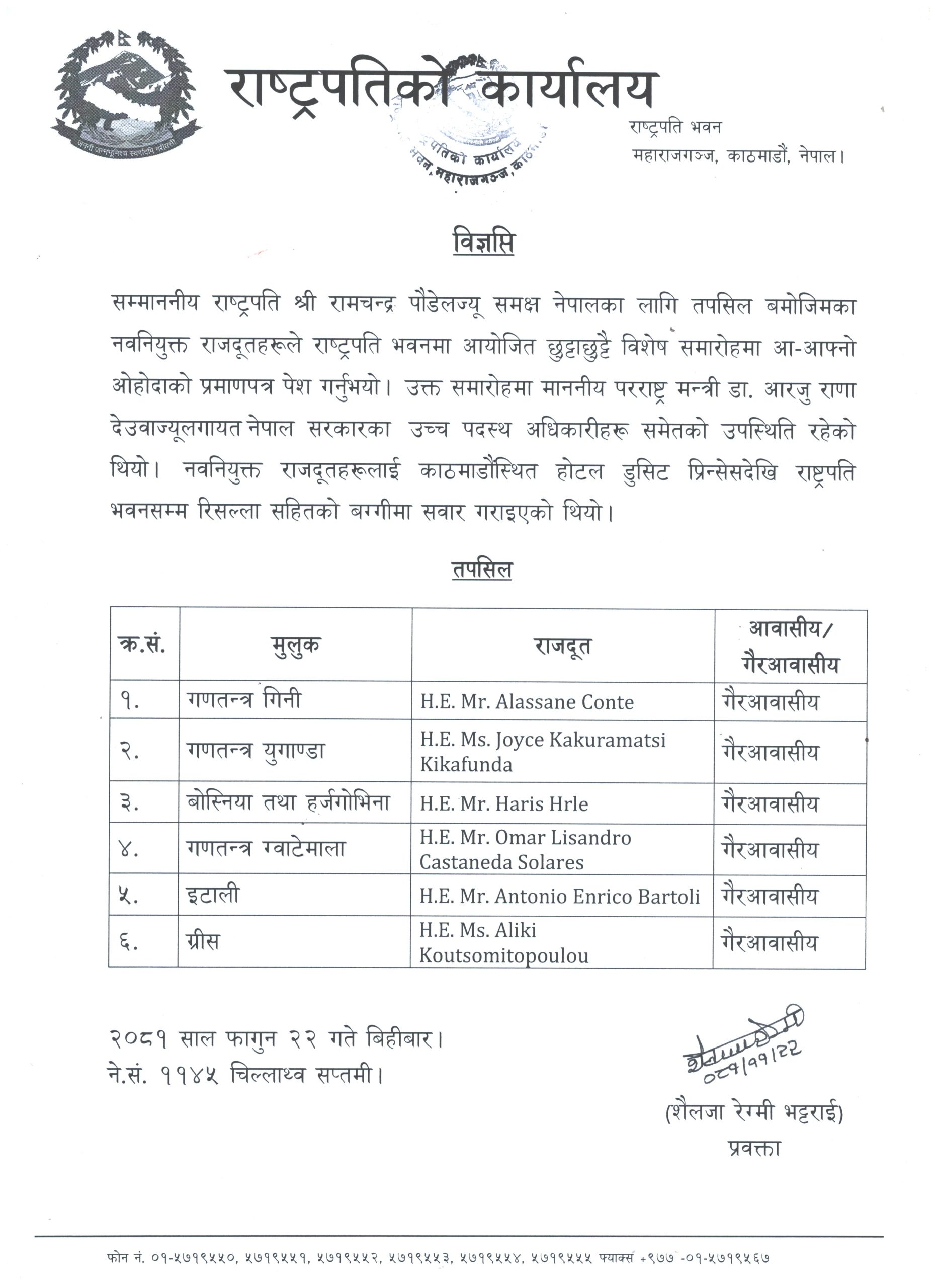 राष्ट्रपति भवन शितल निवासमा बिहीबार आयोजित छुट्टाछुट्टै विशेष समारोहमा उनीहरूले ओहोदाको प्रमाणपत्र पेश गरेका राष्ट्रपति कार्यालयले जनाएको छ ।
