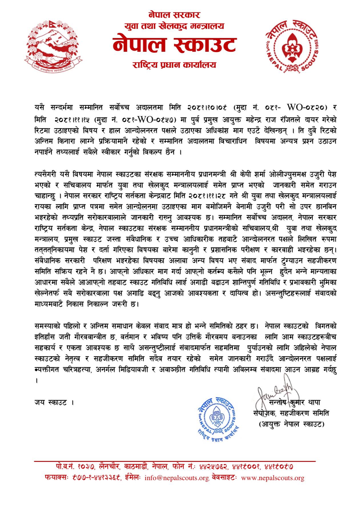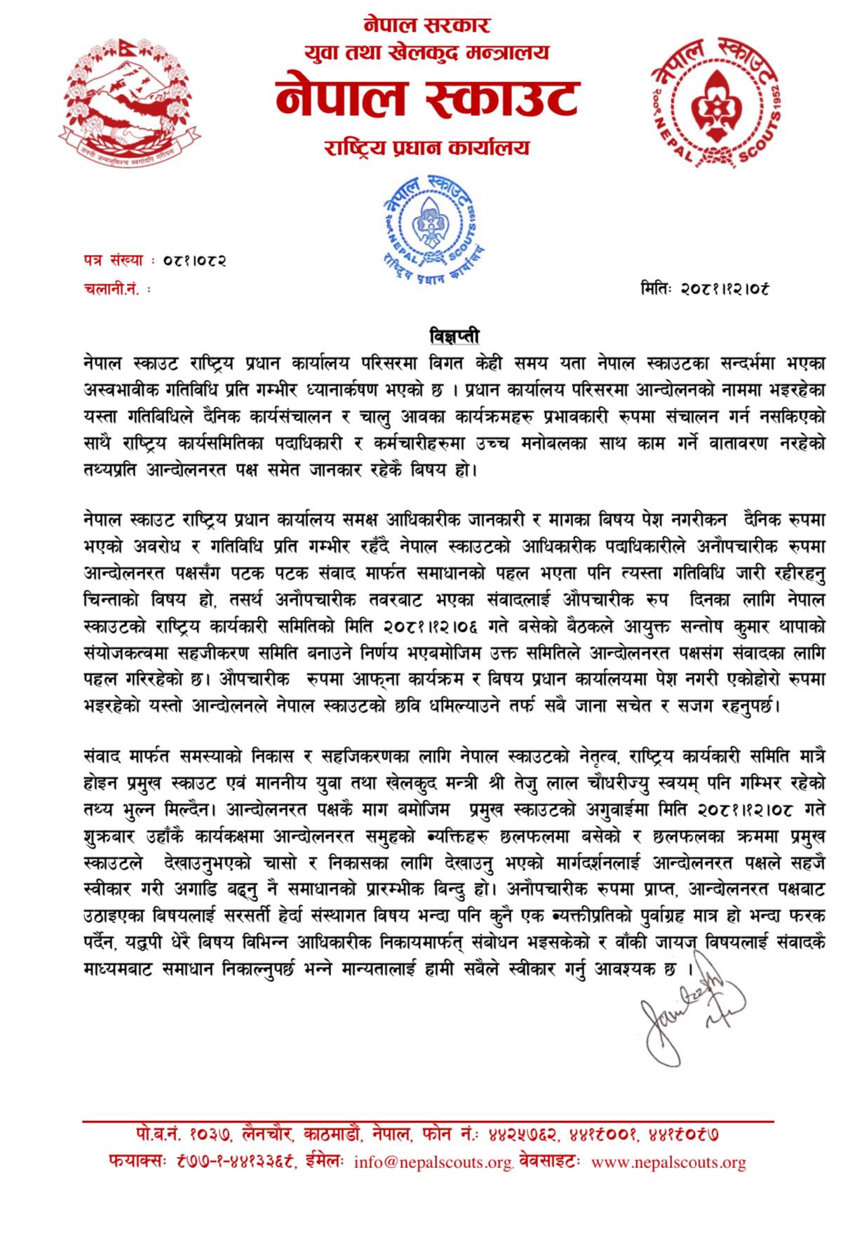 संवादमार्फत समस्याको निकास र सहजिकरणका लागि नेपाल स्काउटको नेतृत्व, राष्ट्रिय कार्यकारी समिति मात्रै होइन प्रमुख स्काउट एवं माननीय युवा तथा खेलकुद मन्त्री तेजुलाल चौधरी पनि गम्भी रहेको विज्ञप्तिा उल्लेख गरिएको छ।