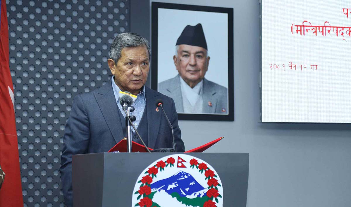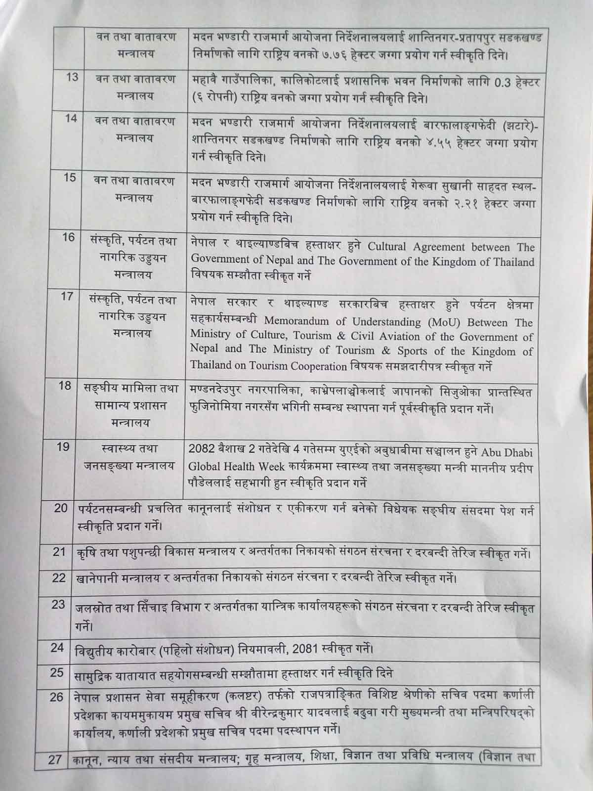 सरकारले मंगलबार मन्त्रिपरिषद् बैठकका निर्णय सार्वजनिक गरेको छ । सोमबारको मन्त्रिपरिषद् बैठकका निर्णय मंगलबार सरकारका प्रवक्ता एवम् सञ्चार तथा सूचना प्रविधिमन्त्री पृथ्वीसुब्बा गुरुङले पत्रकार सम्मेलनमार्फत् २७ निर्णय सार्वजनिक गर्नुभएको हो ।