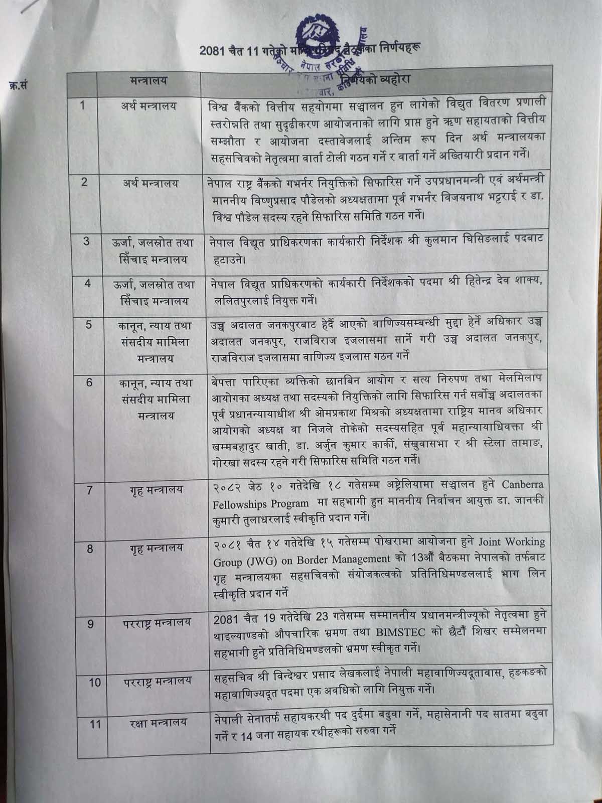 बैठकका निर्णय सार्वजनिक गर्नुहुँदै सरकारका प्रवक्ता गुरुङले सरकारले सरकारले विश्व बैंकको वित्तीय सहयोगमा सञ्चालन हुन लागेको विद्युत वितरण प्रणाली स्तरोन्नति तथा सुदृढीकरण आयोजनाको लागि प्राप्त हुने ऋण सहायताको वित्तीय सम्झौता र आयोजना दस्तावेजलाई अन्तिम रूप दिन अर्थ मन्त्रालयका सहसचिवको नेतृत्वमा वार्ता टोली गठन गर्ने र वार्ता गर्ने अख्तियारी प्रदान गर्ने निर्णय गरेको जानकारी दिनुभयो।