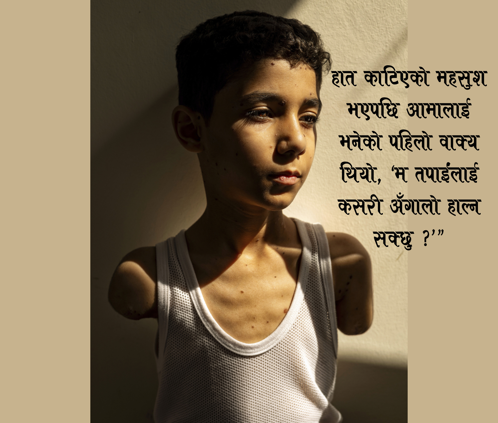“महमुदकी आमाले मलाई बताएकी सबैभन्दा कठिन कुरामध्ये एउटा के थियो भने जब महमुदलाई पहिलो पटक आफ्नो हात काटिएको महसुस भयो, उनले आमालाई भनेको पहिलो वाक्य थियो, ‘म तपाईंलाई कसरी अँगालो हाल्न सक्छु ?’”, विश्व प्रेस फोटो सङ्गठनले जारी गरेको विज्ञप्तिमा अबु इलुफले भन्नुभएको छ ।