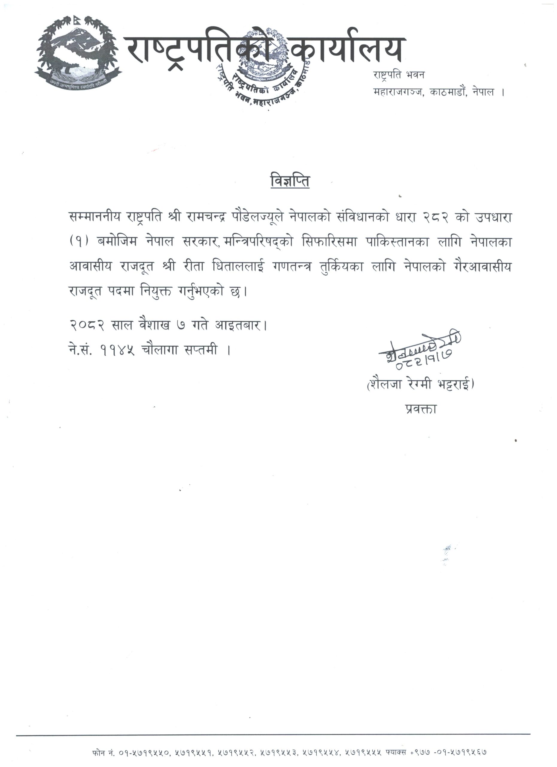 राष्ट्रपति रामचन्द्र पौडेलले पाकिस्तानका लागि नेपालका आवासीय राजदूत रीता धिताललाई गणतन्त्र टर्कीका लागि नेपालको गैरआवासीय राजदूत पदमा नियुक्त गर्नुभएको छ ।