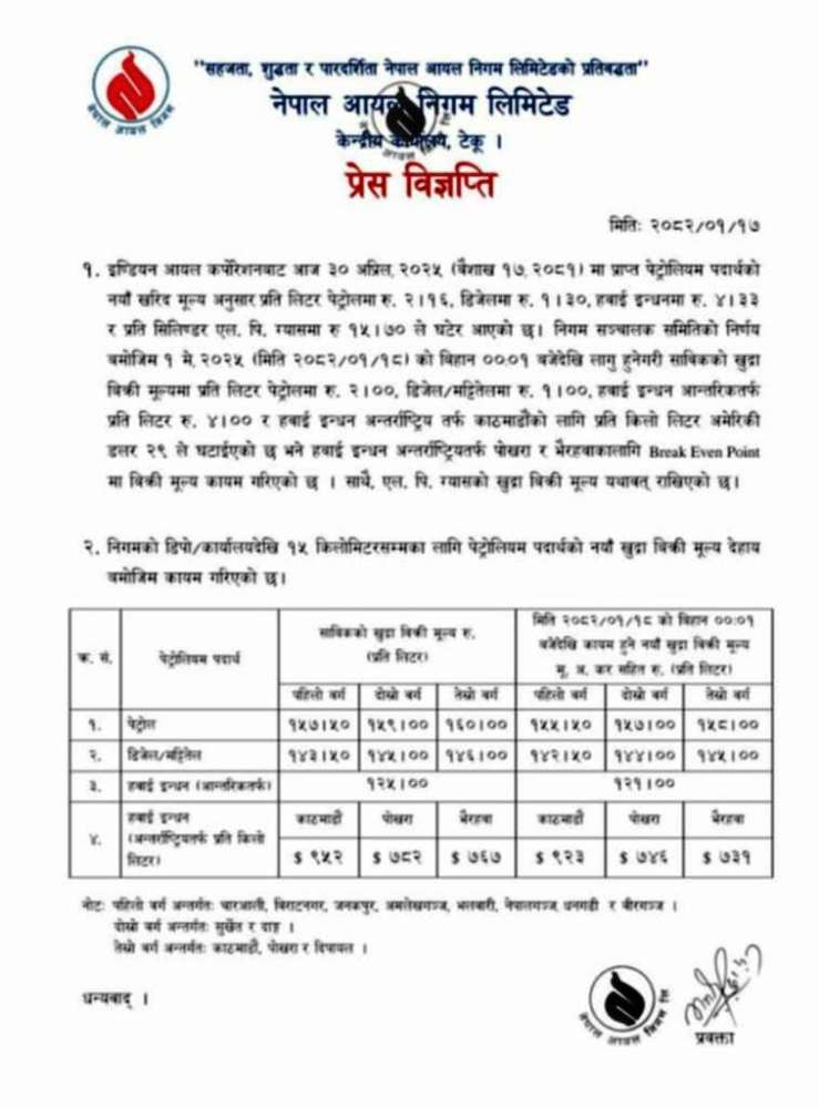 नेपाल आयल निगमले पेट्रोलियम पदार्थको मूल्य घटाएको छ ।