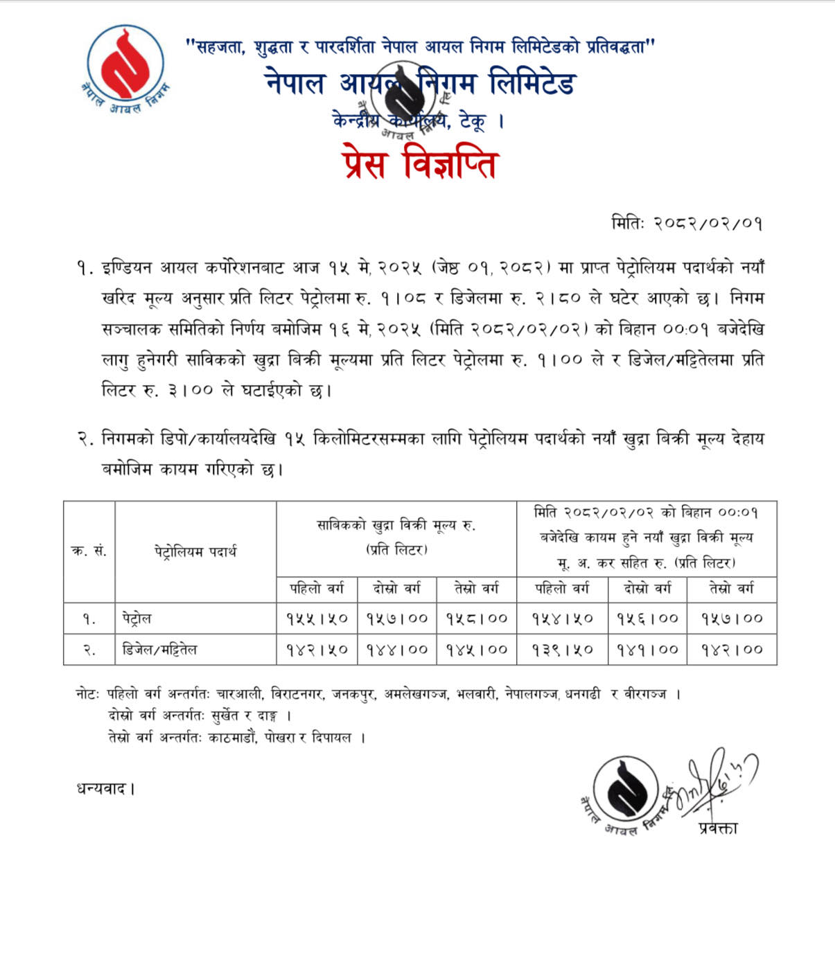 निगमले बिहीबार राति १२ः०० बजेदेखि लागू हुनेगरी पेट्रोल, डिजेल र मट्टितेलको मूल्य घटाएको हो।