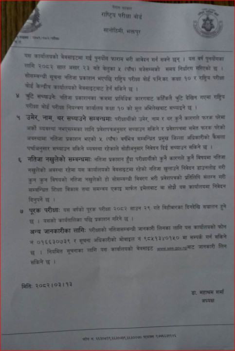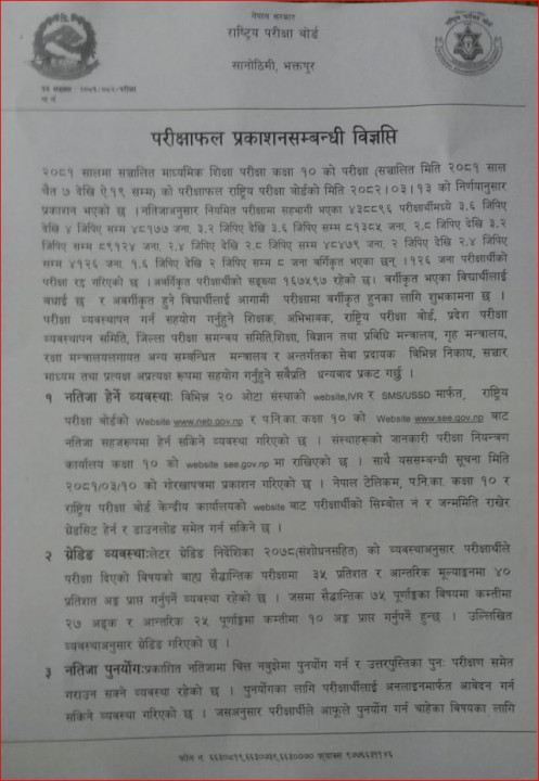 नतिजासम्बन्धी विवरणहरू एसएमएस, आईभीआर र वेबसाइटमार्फत हेर्न सकिने बोर्डले जनाएको छ । गत २०८१ सालको चैत ७ गतेदेखि १९ गतेसम्म सञ्चालन भएको एसइईमा नियमिततर्फ ४ लाख ३१ हजार ४६६ र ग्रेड वृद्धितर्फ ६७ हजार ७१५ गरी जम्मा ४ लाख ९९ हजार १८३ विद्यार्थी सहभागी भएका थिए ।