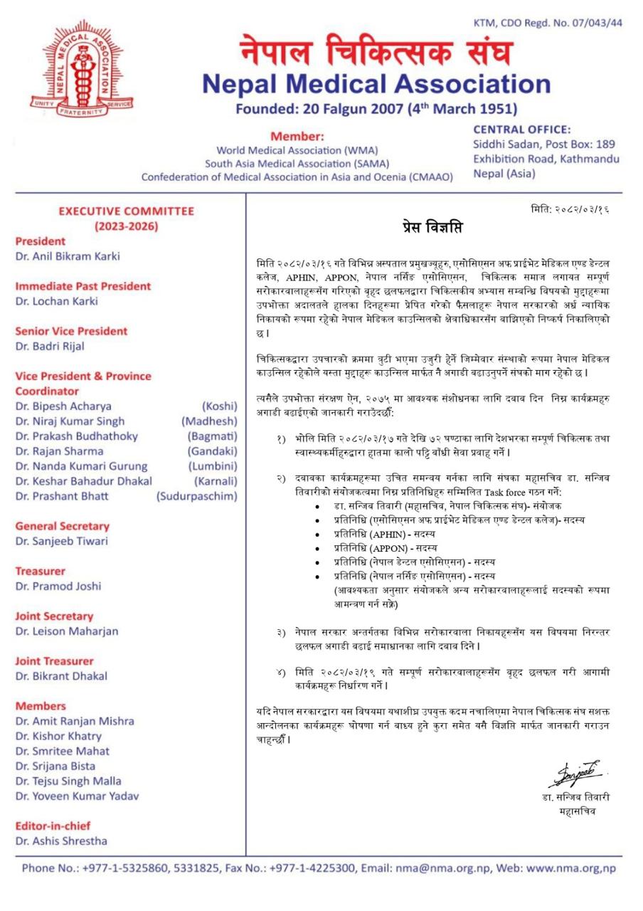 त्यसैगरी महासचिव डा. सन्जिव तिवारीको संयोजकत्वमा विभिन्न स्वास्थ्य संघसंस्थाका प्रतिनिधिहरू समावेश गरिएको टास्क फोर्स बनाउने निर्णय गरिएको छ।नेपाल सरकारअन्तर्गत सरोकारवाला निकायहरूसँग संवाद गरी समस्या समाधानका लागि दबाब सिर्जना गर्ने र असार १९ गते पुनः सबै सरोकारवालासँग बैठक गरी भावी रणनीति तय गरिने बताइएको छ।