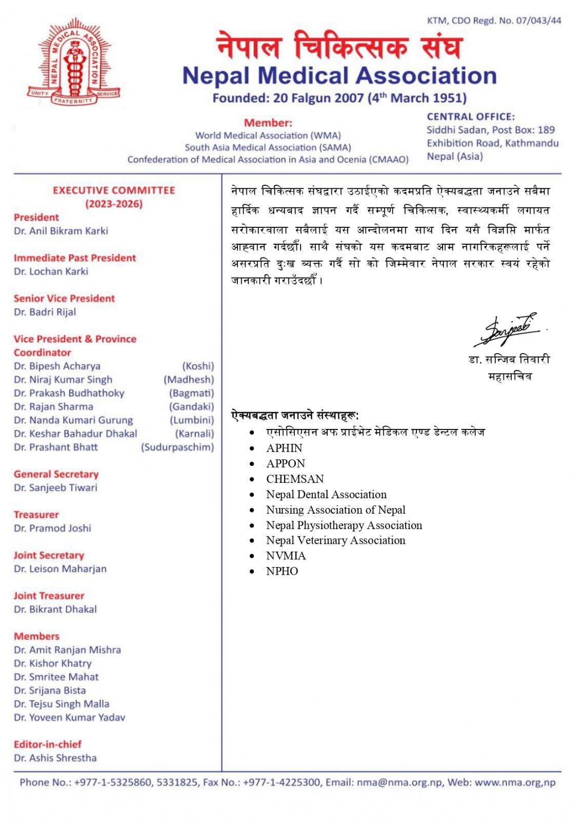 आन्दोलनमा एसोसिएसन अफ प्राइभेट मेडिकल एण्ड डेन्टल कलेज, अफिन, एपोन, केमसन, नेपाल नर्सिङ एसोसिएसन, नेपाल फिजियोथेरापी एसोसिएसन, नेपाल भेटेरिनरी एसोसिएसन, एनाभीएमआईए, एनपीएचओ ऐक्यबद्धता जनाएका छन्।