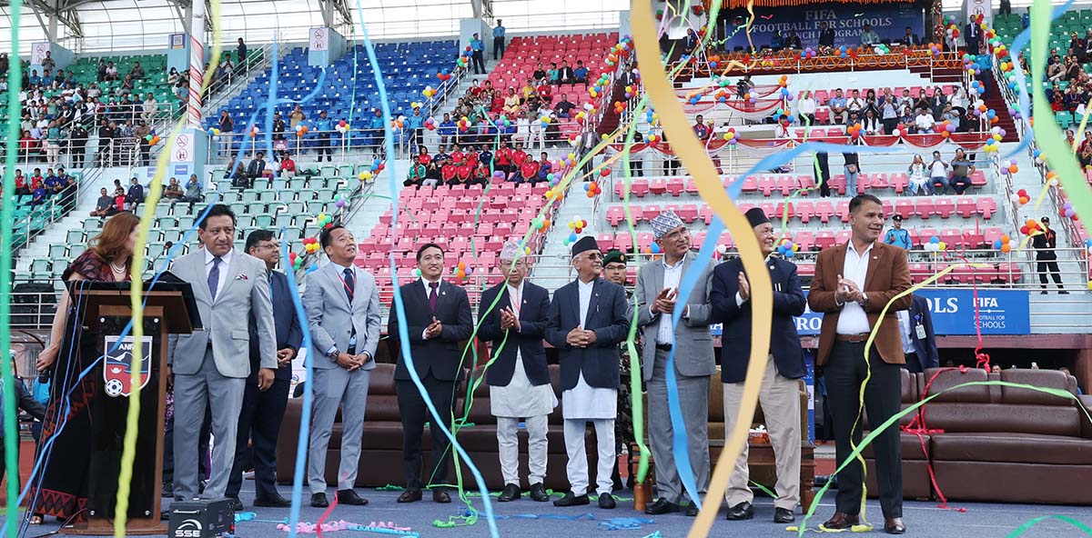 दशरथ रङ्गशालामा आयोजित विशेष कार्यक्रमबिच प्रधानमन्त्री ओलीले विश्व फुटबल महासङ्घ (फिफा)को सहयोगमा प्राप्त करिब एक हजार विद्यालयलाई नि:शुल्क फुटबल वितरण पनि गर्नुभयो ।