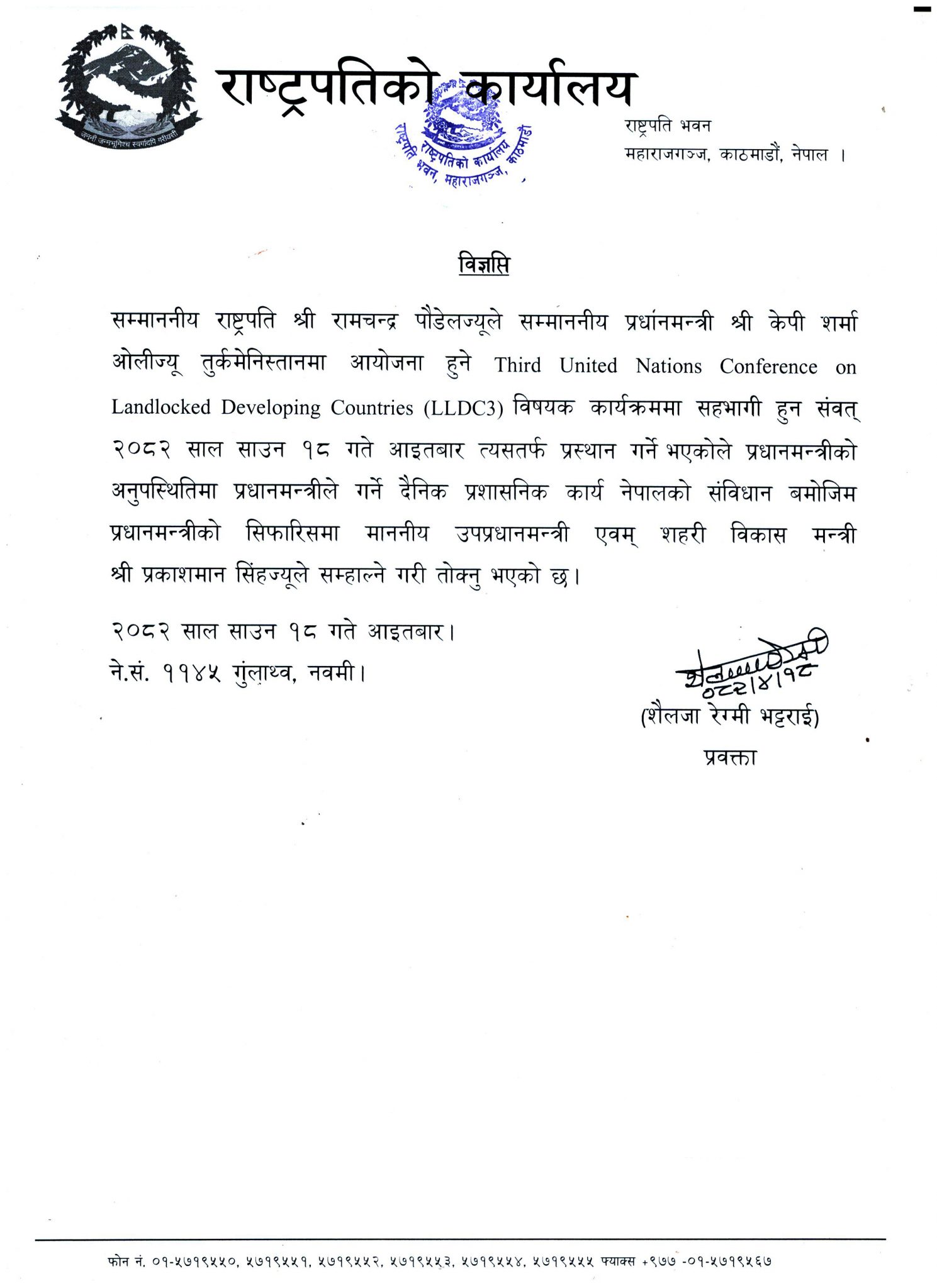 राष्ट्रपति रामचन्द्र पौडेलले प्रधानमन्त्रीको अनुपस्थितिमा प्रधानमन्त्रीले गर्ने दैनिक प्रशासनिक कार्य गर्ने गरी उपप्रधानमन्त्री एवम् शहरी विकासमन्त्री प्रकाशमान सिंहलाई जिम्मेवारी तोक्नुभएको छ ।