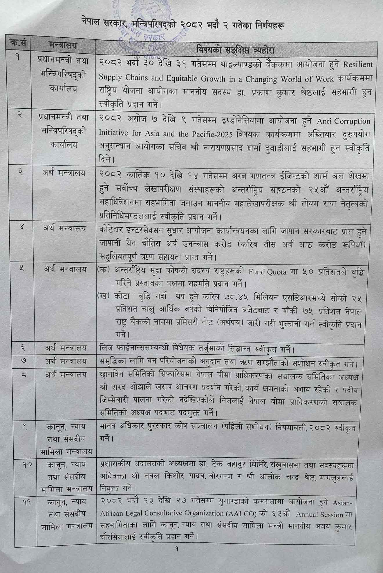 त्यस्तै, आगामी भदौ ३० देखि ३१ गतेसम्म थाइल्यान्डको बैंककमा आयोजना हुने रिजिलियन्ट सप्लाइ चेइन्स, एन्ड इक्युटेवल ग्रोथ इन अ चेन्जीङ वल्र्ड अफ वर्क कार्यक्रममा राष्ट्रिय योजना आयोगका सदस्य डा. प्रकाशकुमार श्रेष्ठलाई सहभागी हुन स्वीकृति प्रदान गर्ने, आगामी असोज ७ देखि ९ गतेसम्म इन्डाेनेसियामा आयोजना हुने एन्टी क्रप्सन इनिसिएटिभ फर एसिया एन्ड द पेसिफिक–२०२५ विषयक कार्यक्रममा अख्तियार दुरुपयोग अनुसन्धान आयोगका सचिव नारायणप्रसाद शर्मा दुवाडीलाई सहभागी हुन स्वीकृति दिने सरकारको निर्णय छ । आगामी कात्तिक १० देखि १४ गतेसम्म अरब गणतन्त्र इजिप्टको शार्म अल शेखमा हुने सर्वोच्च लेखापरीक्षण संस्थाहरूको अन्तर्राष्ट्रिय सङ्गठनको २५ औं अन्तर्राष्ट्रिय महाधिवेशनमा सहभागिता जनाउन महालेखापरीक्षक तोयम राया नेतृत्वको प्रतिनिधिमण्डललाई स्वीकृति प्रदान गर्ने, कोटेश्वर इन्टरसेक्सन सुधार आयोजना कार्यान्वयनका लागि जापान सरकारबाट प्राप्त हुने जापानी येन चौतिस अर्ब उनन्चास करोड (करिब तीस अर्ब आठ करोड रुपियाँ) सहुलियतपूर्ण ऋण सहायता प्राप्त गर्ने, अन्तर्राष्ट्रिय मुद्रा कोषको सदस्य राष्ट्रहरूका फन्ड कोटामा ५० प्रतिशतले वृद्धि गरिने प्रस्तावको पक्षमा सहमति प्रदान गर्ने, कोटा वृद्धि गर्दा थप हुने करिब ७८.४५ मिलियन एसडिआर मध्ये सोको २५ प्रतिशत चालु आर्थिक वर्षको विनियोजित बजेटबाट र बाँकी ७५ प्रतिशत नेपाल राष्ट्र बैँकको नाममा प्रमिसरी नोट (अर्थपत्र) जारी गरी भुक्तानी गर्न स्वीकृति प्रदान गर्ने, लिज फाइनान्ससम्बन्धी विधेयक तर्जुमाको सिद्धान्त स्वीकृत गर्ने, समृद्धिका लागि वन परियोजनाको अनुदान तथा ऋण सम्झौताको संशोधन स्वीकृत गर्ने सरकारको निर्णय छ ।