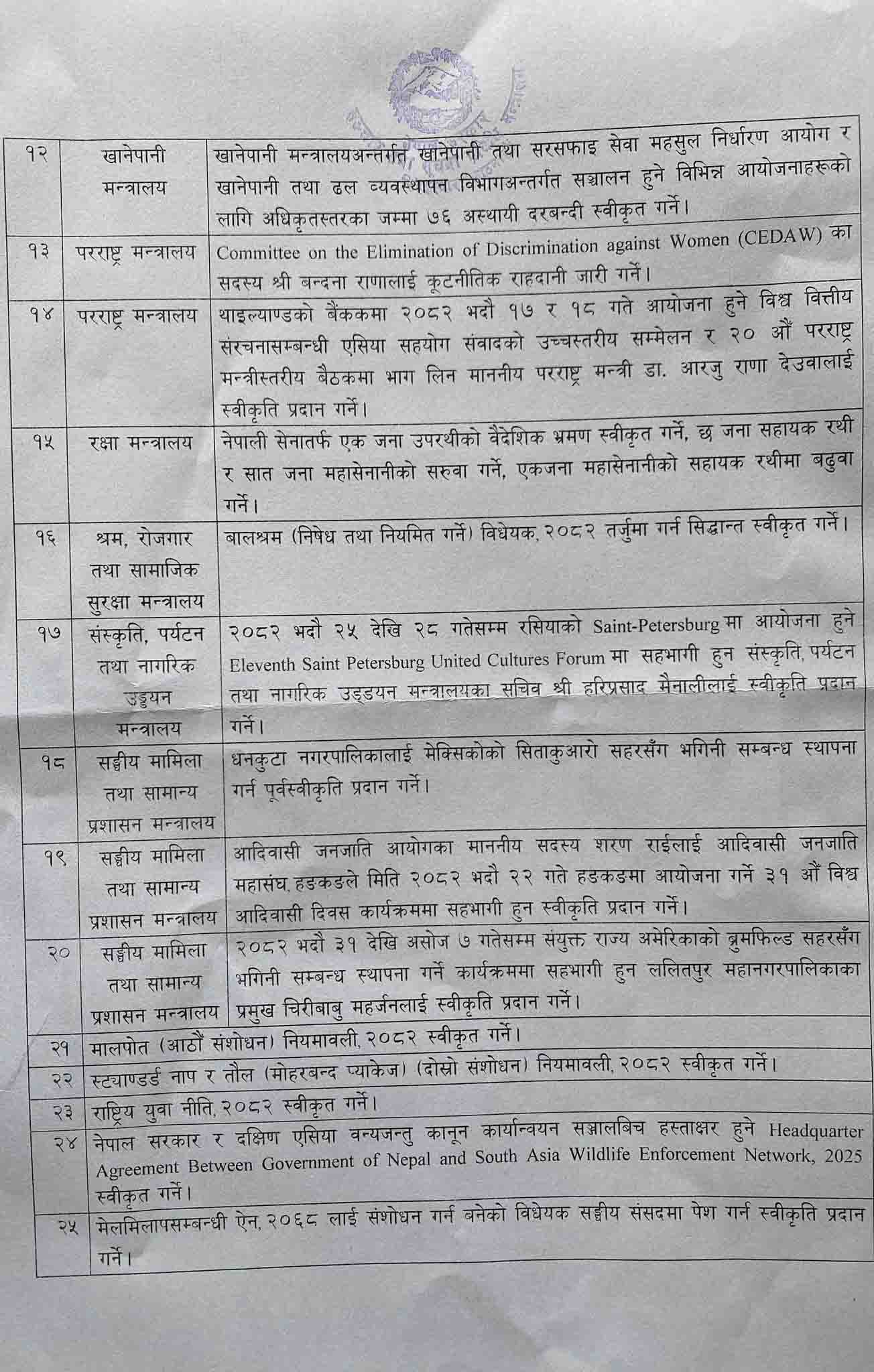 यस्तै, भदौ २५ देखि २८ गतेसम्म रसियाको सेन्ट–पेटरर्सवर्ग मा आयोजना हुने इलेभेन्थ सेन्ट पेटरर्सवर्ग युनाइटेड कल्चर्स फोरममा सहभागी हुन संस्कृति, पर्यटन तथा नागरिक उड्डयन मन्त्रालयका सचिव हरिप्रसाद मैनालीलाई स्वीकृति प्रदान गर्ने, धनकुटा नगरपालिकालाई मेक्सिकोको सिताकुआरो सहरसँग भगिनी सम्बन्ध स्थापना गर्न पूर्वस्वीकृति प्रदान गर्ने, आदिवासी जनजाति आयोगका सदस्य शरण राईलाई आदिवासी जनजाति महासङ्घ, हङकङले मिति २०८२ भदौ २२ गते हङकङमा आयोजना गर्ने ३१ औं विश्व आदिवासी दिवस कार्यक्रममा सहभागी हुन स्वीकृति प्रदान गर्ने सरकारको निर्णय छ ।