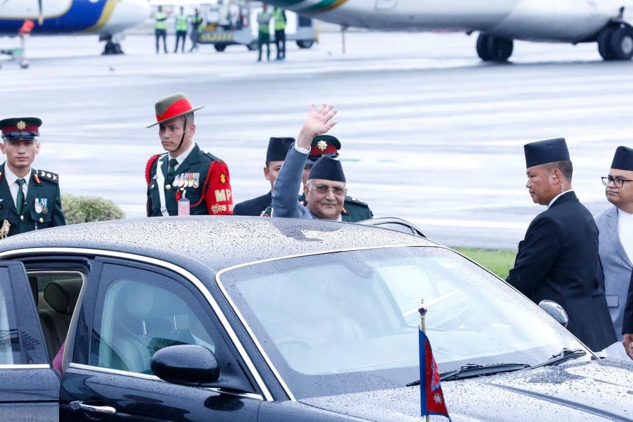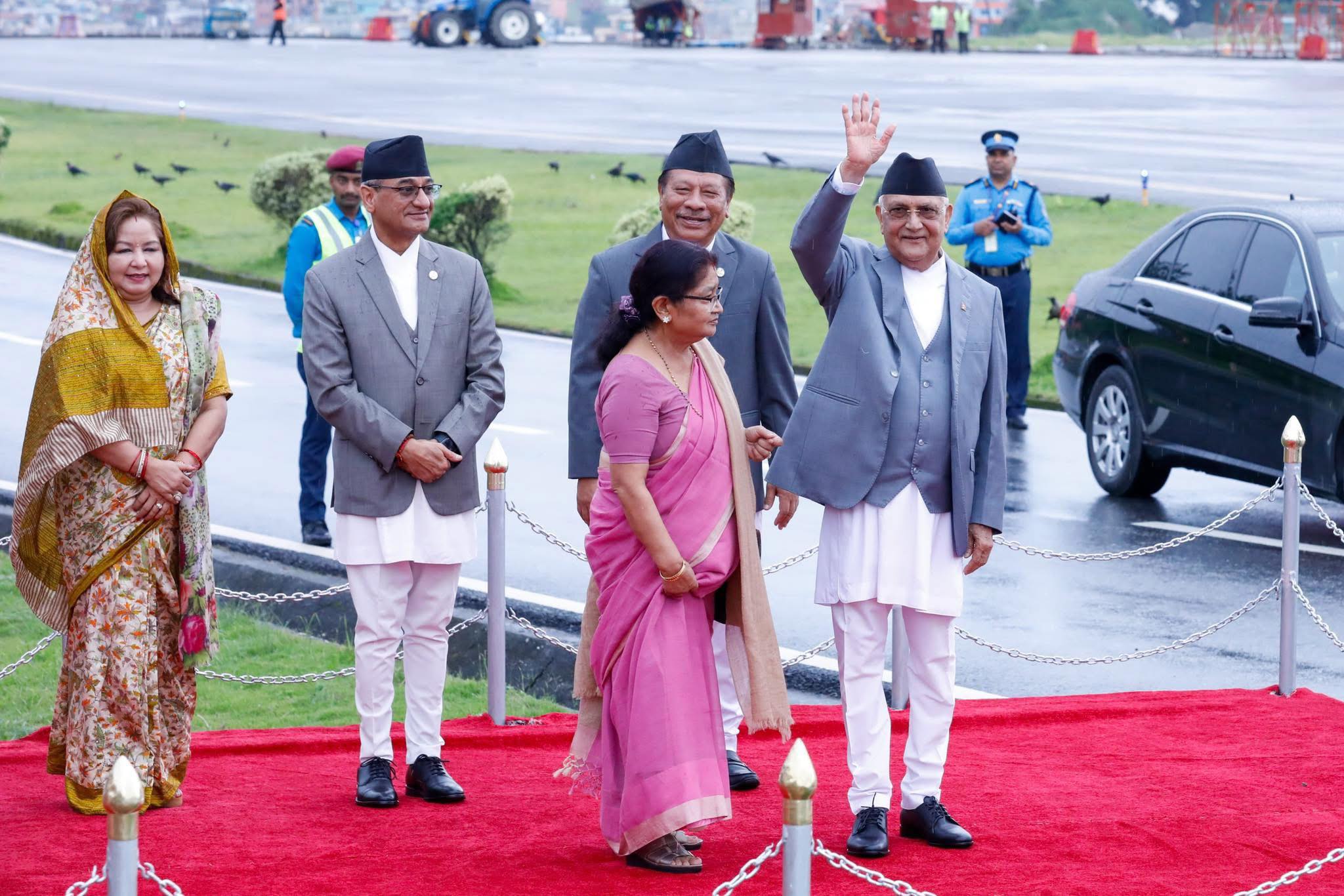 त्रिभुवन अन्तरराष्ट्रिय विमानस्थलको अतिविशिष्ट कक्षमा प्रधानमन्त्री ओलीलाई उपप्रधानमन्त्री एवं सहरी विकासमन्त्री प्रकाशमान सिंह, गृहमन्त्री रमेश लेखक, परराष्ट्रमन्त्री डा आरजु राणा देउवा तथा मुख्यसचिव एकनारायण अर्यालले बिदाइ गर्नुभयो ।