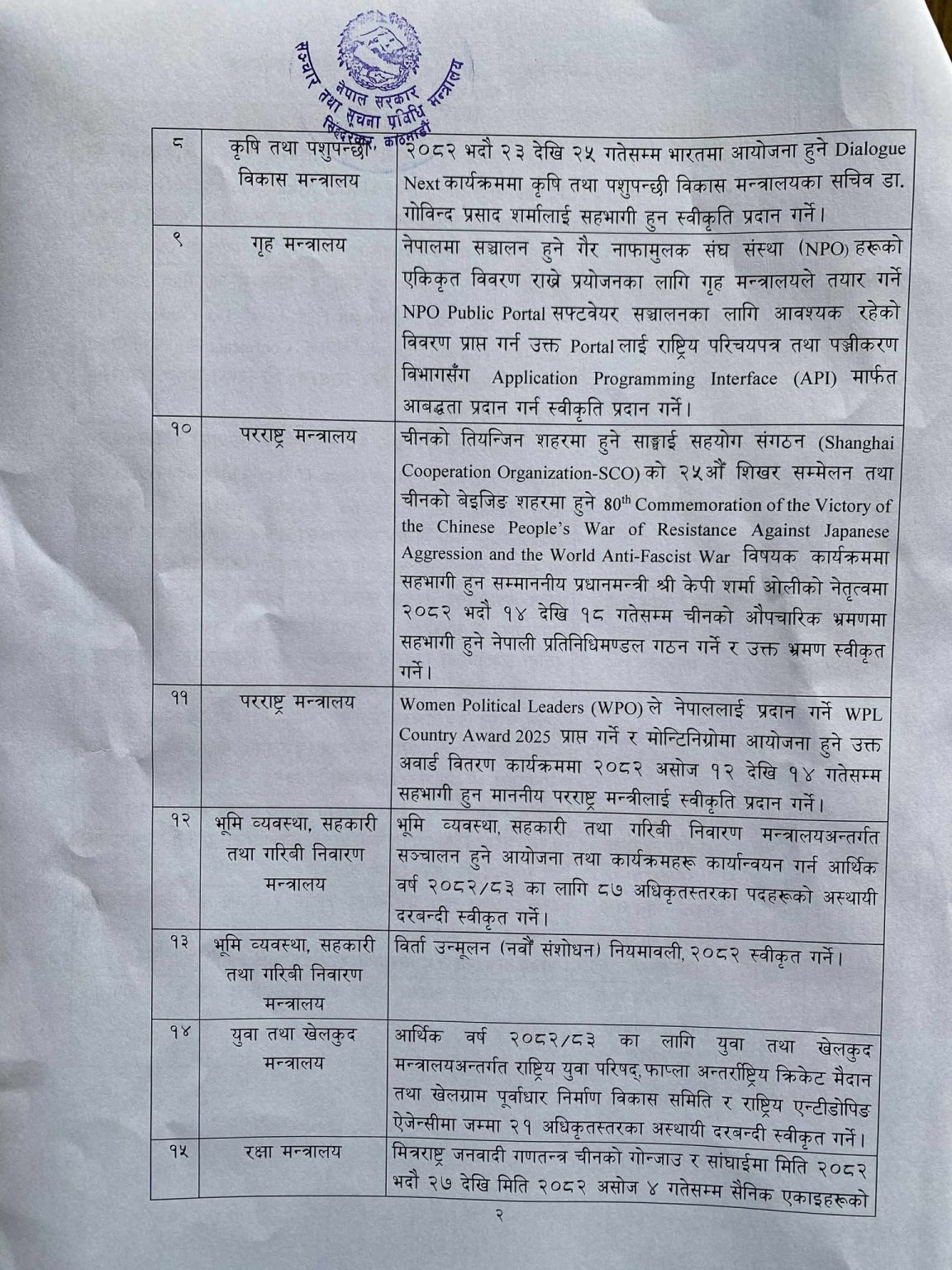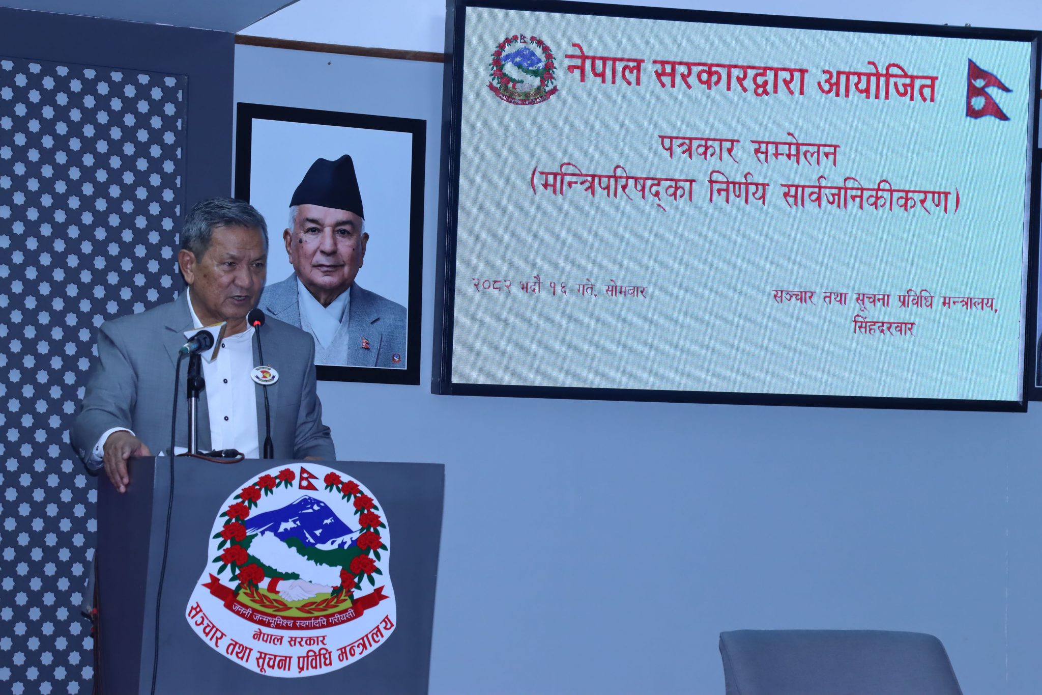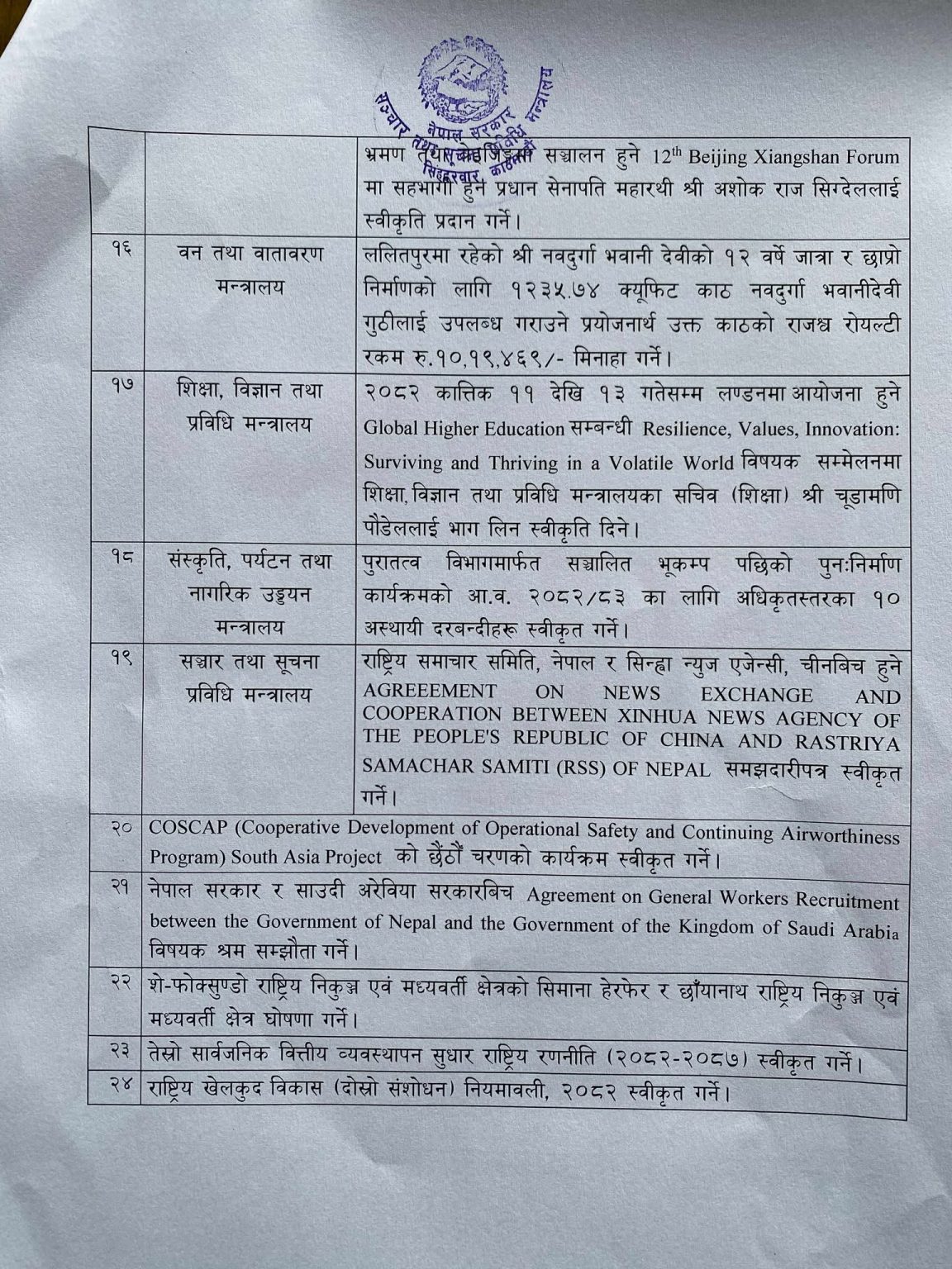 यस्तै, सञ्चार मन्त्री गुरुङले बिर्ता उन्मूलन नवौँ संशोधन नियमावली २०८२ स्वीकृत गर्ने, राष्ट्रिय समाचार समिति नेपाल र सिन्हा न्युज एजेन्सी चीनबीच हुने अग्रीमेन्ट अन न्युज एक्सचेन्ज समझदारी पत्र स्वीकृत गर्ने लगायतका निर्णयहरू भएको बताउनुभयो ।