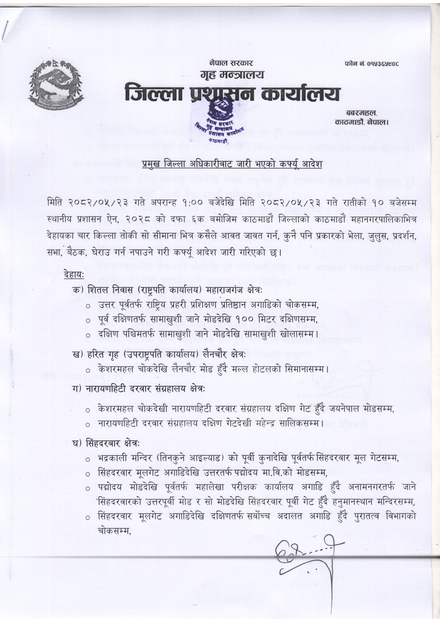 प्रशासन कार्यालयले सिंहदरबार क्षेत्रको भद्रकाली मन्दिर (तीनकुने आइल्याड) को पूर्वी कुनादेखि पूर्वतर्फ सिंहदरबार मूल गेटसम्म, सिंहदरबार मूलगेट अगाडिदेखि उत्तरतर्फ पद्मोदय माविको मोडसम्म, पद्मोदय मोडदेखि पूर्वतर्फ महालेखा परीक्षक कार्यालयअगाडि हुँदै अनामनगरतर्फ जाने सिंहदरबारको उत्तरपूर्वी मोड र सो मोडदेखि सिंहदरबार पूर्वी गेट हुँदै हनुमानस्थान मन्दिरसम्म र सिंहदरबार मूलगेट अगाडिदेखि दक्षिणतर्फ सर्वोच्च अदालत अगाडि हुँदै पुरातत्व विभागको चोकसम्म कर्फ्यू आदेश जारी गरेको छ।