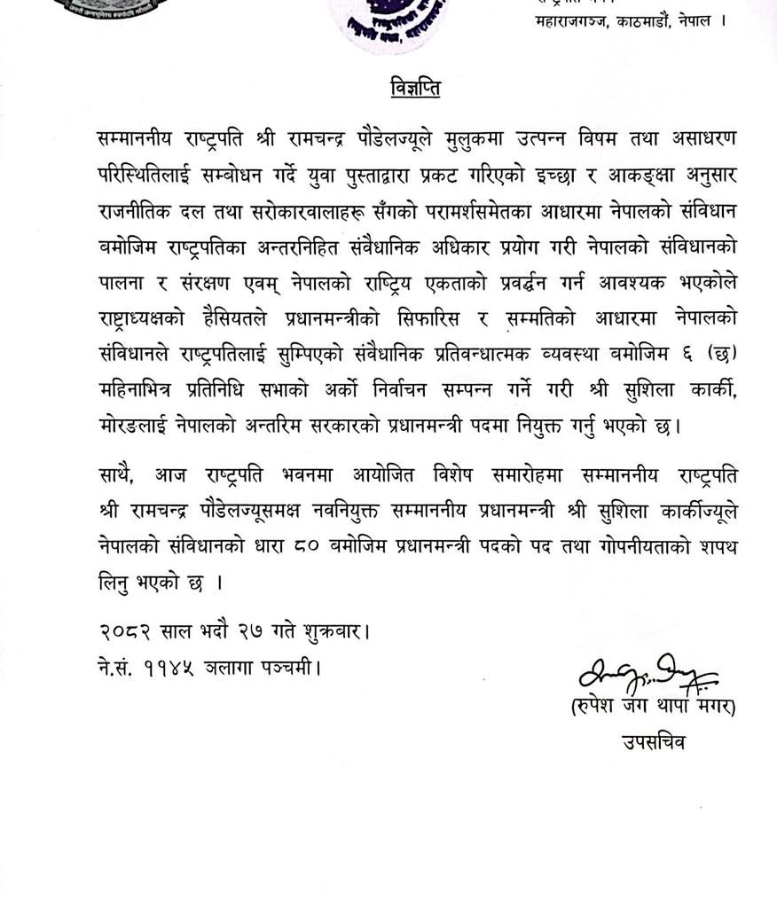 राष्ट्रपति पौडेलले असाधारण परिस्थितिमा युवा पुस्ताद्वारा प्रकट गरिएको माग र आकाक्षा अनुसार, राजनीतिक दल र सरोकारबालासँगको परामर्शमा उहाँलाई नियुक्ति गर्नुभएको हो।