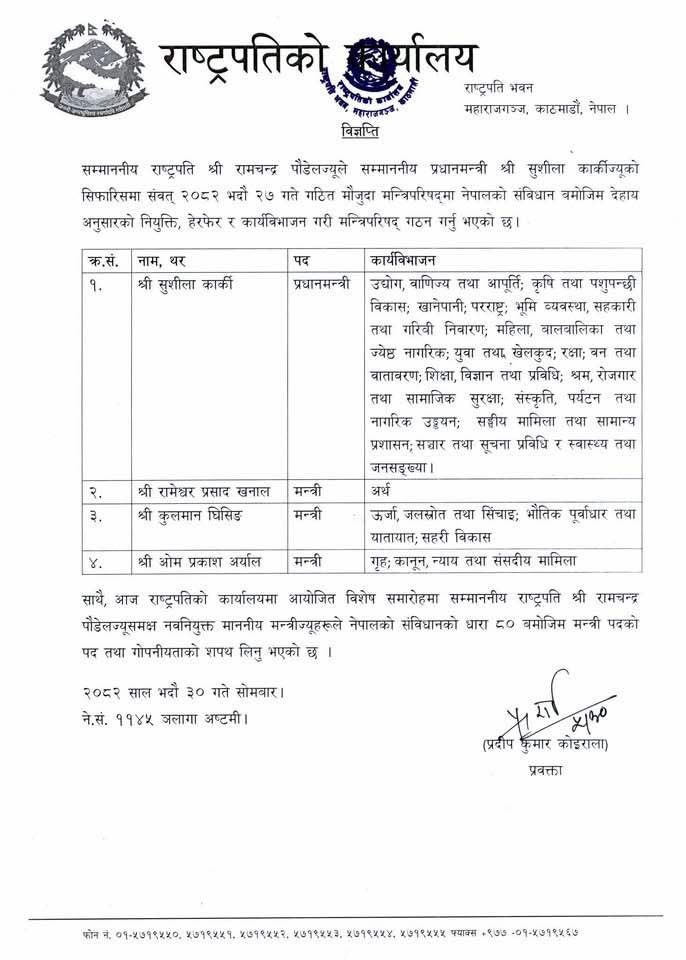 ‘जेनजी’ समूहको आन्दोलन र उत्पन्न परिस्थितिका बीच राष्ट्रपति पौडेलले पूर्वप्रधानन्यायाधीश कार्कीलाई यही भदौ २७ गते अन्तरिम सरकारको प्रधानमन्त्रीमा नियुक्त गर्नुभएको थियो ।