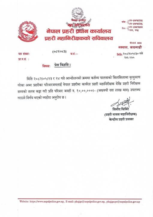 उहाँले आज जारी गरेको सूचनामा भनिएको छ, “यही भदौ २३ र २४ गते आन्दोलनका क्रममा कर्तव्य पालनाको सिलसिलामा मृत्युवरण गरेका अमर प्रहरीका परिवारजनलाई प्रहरी महानिरीक्षकदेखि प्रहरी निरीक्षकसम्मको तलब कट्टा गरी प्रतिपरिवार जनही रु १० लाख उपलब्ध गराउने निर्णय भएको ब्यहोरा अनुरोध छ ।”