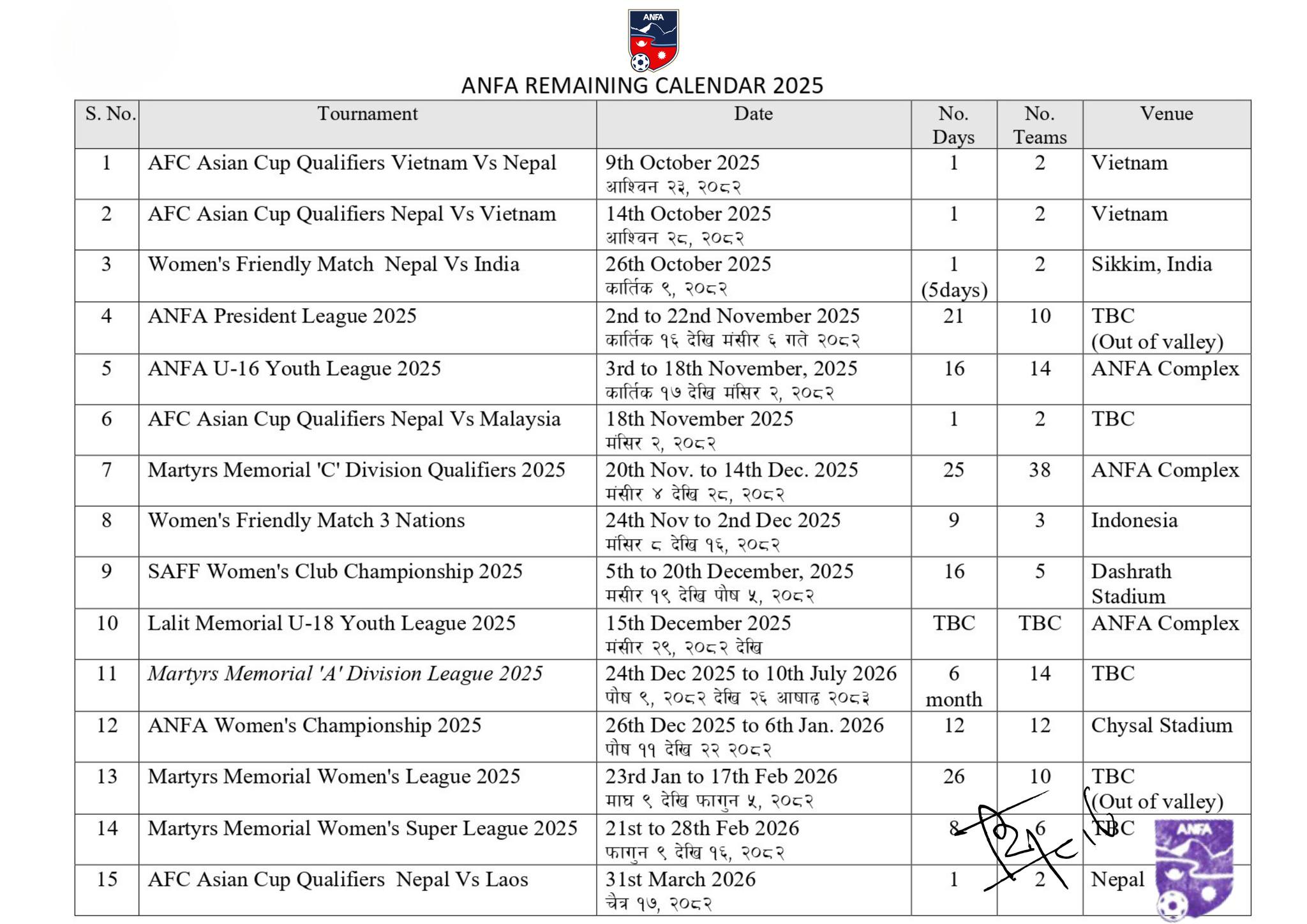 यस्तै यु–१६ युथ लिग कार्तिक १७ देखि पुन: सुचारु गरिने, महिला फुटबल टोलीले भारतसँग मैत्रीपूर्ण फुटबल खेल्ने, महिला लिग र सुपर लिग गर्ने लगायत गतिविधि उल्लेख छ । एन्फाले यसअघि सञ्चालन हुँदै आएको नेपाल सुपर लिग (एनएसएल) भने समावेश गरेको छैन ।