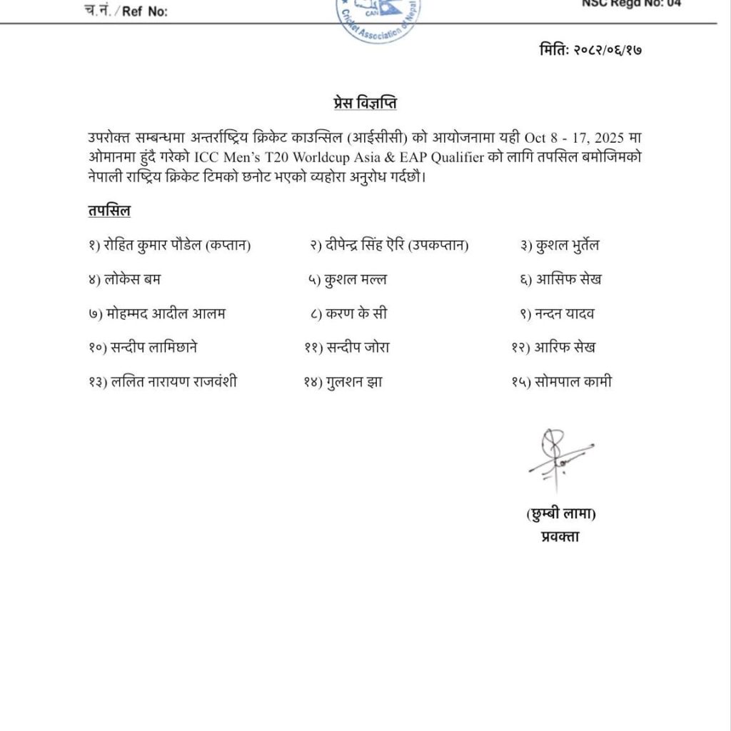 नेपाल क्रिकेट सङ्घ (क्यान) ले अन्तरराष्ट्रिय क्रिकेट काउन्सिल (आइसिसी) को आयोजनामा आगामी बुधबारदेखि ओमानमा हुने आइसिसी पुरुष टी–२० विश्वकप २०२६ को एसिया तथा इस्ट एसिया प्यासिफिक छनोट खेलका लागि १५ सदस्यीय टोली घोषणा गरेको छ ।